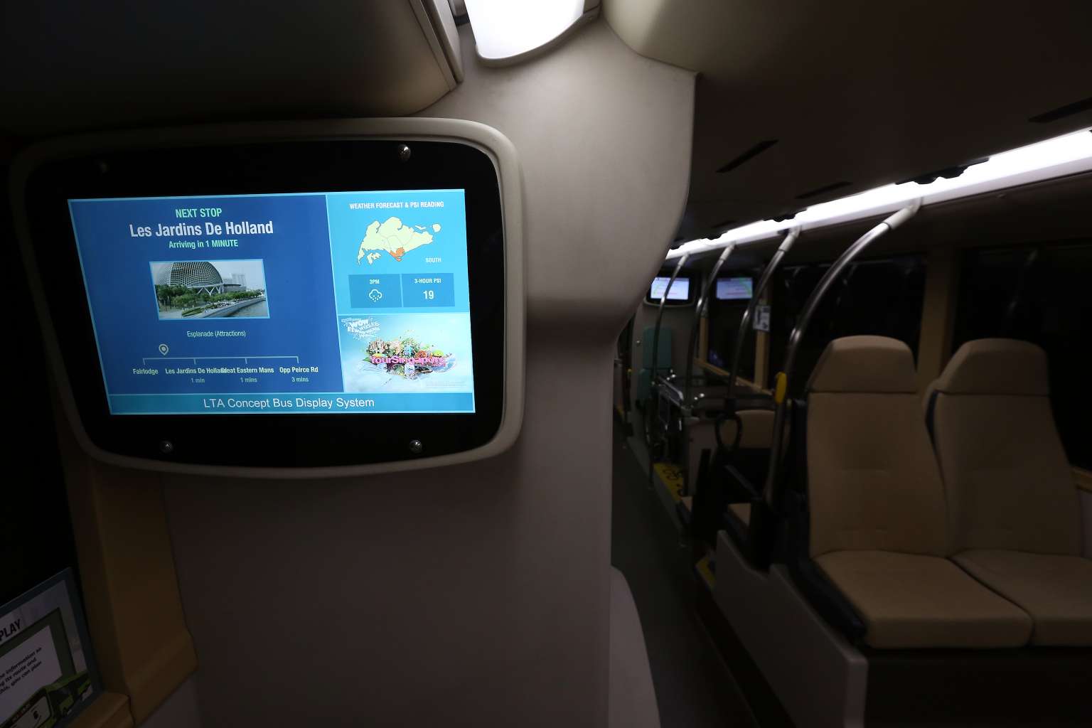 A screen showing information on the bus route and upcoming stops aboard Bus B, one of the concept double-decker buses.