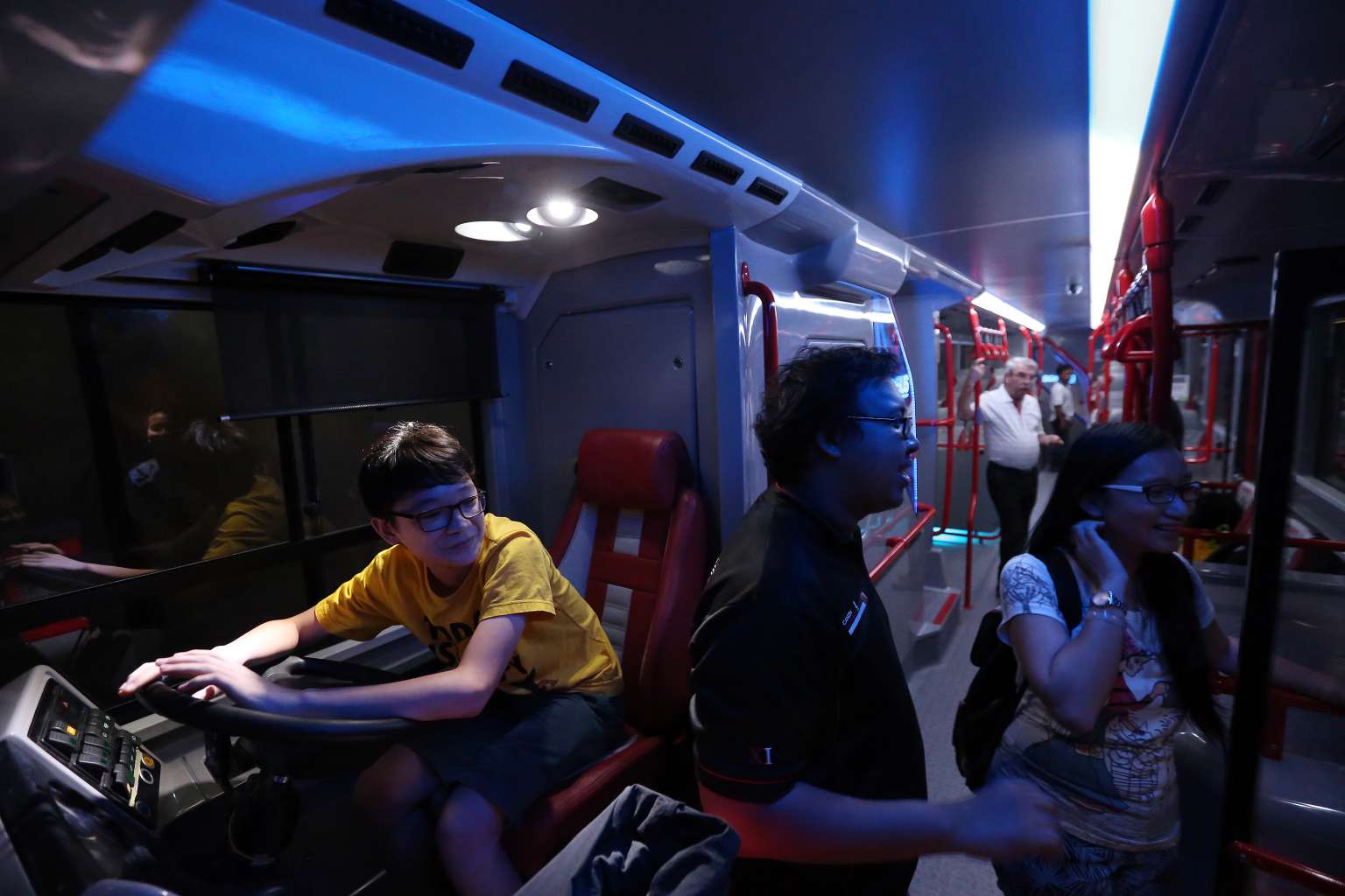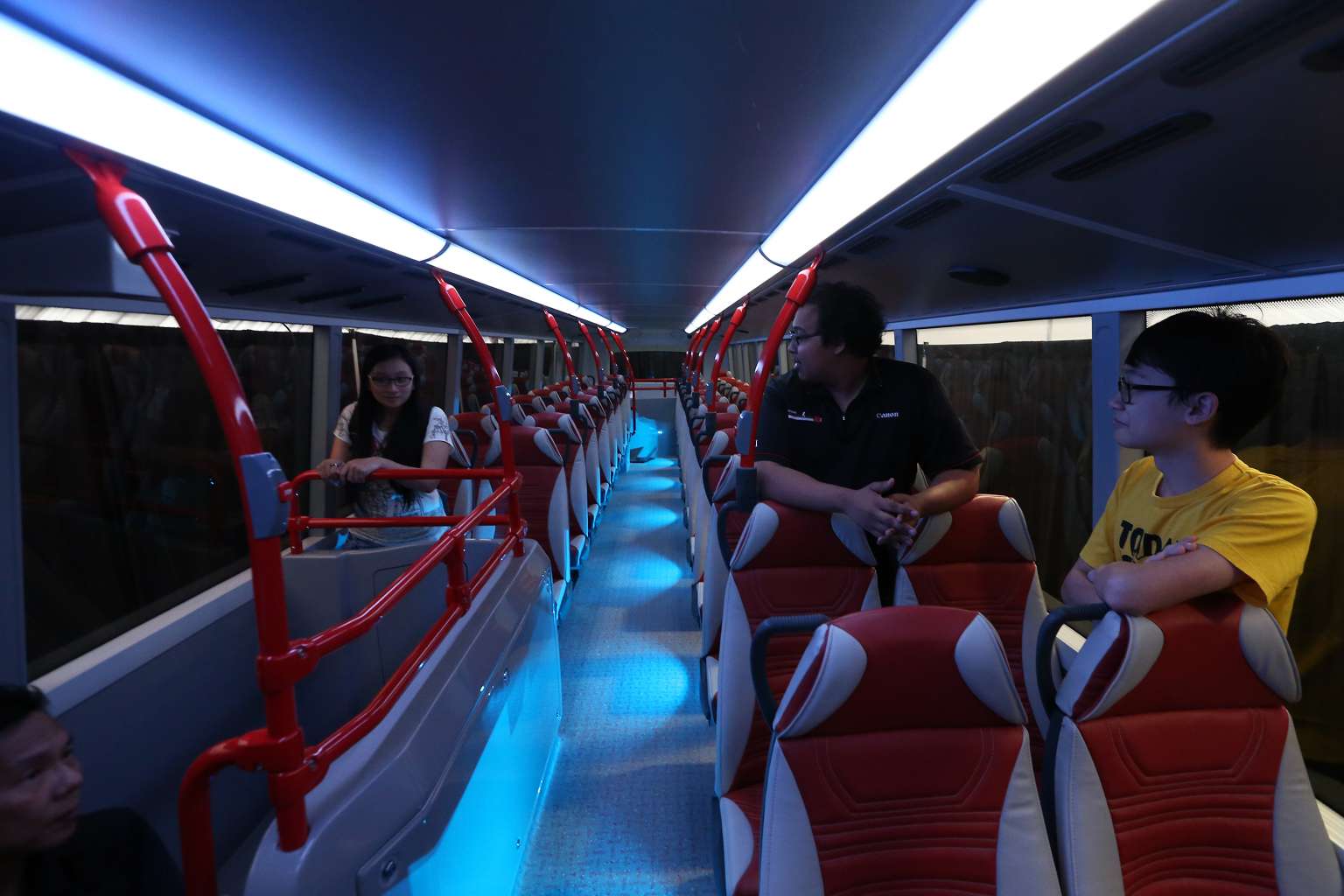Visitors taking a look inside Bus A, one of the concept double-decker buses.