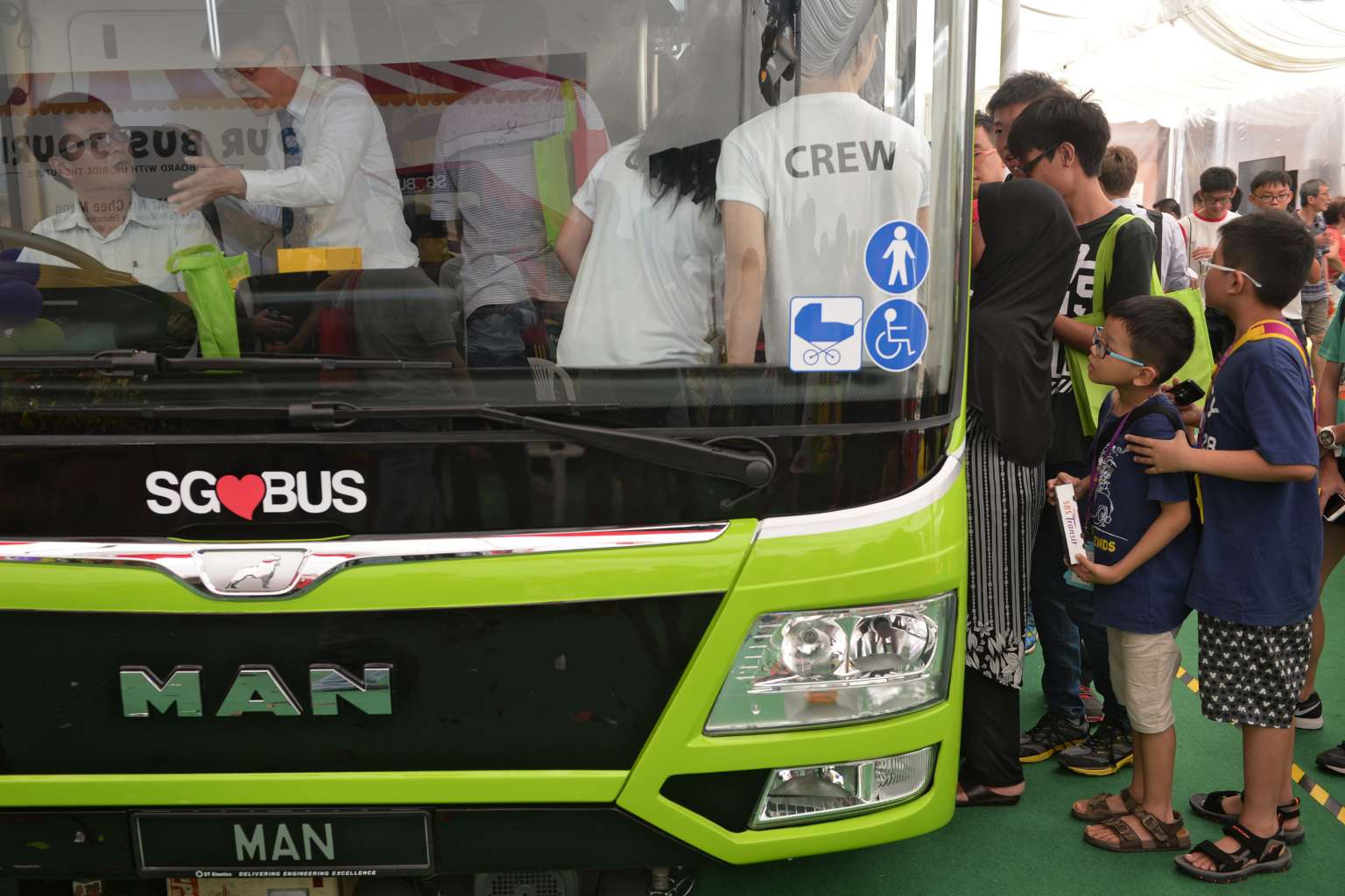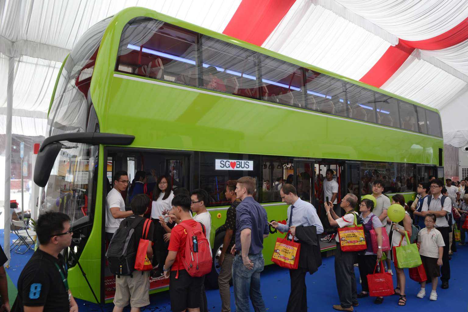 People queueing up for a tour of the new green bus at the Bus Carnival at Ngee Ann Civic Plaza on March 11, 2016.