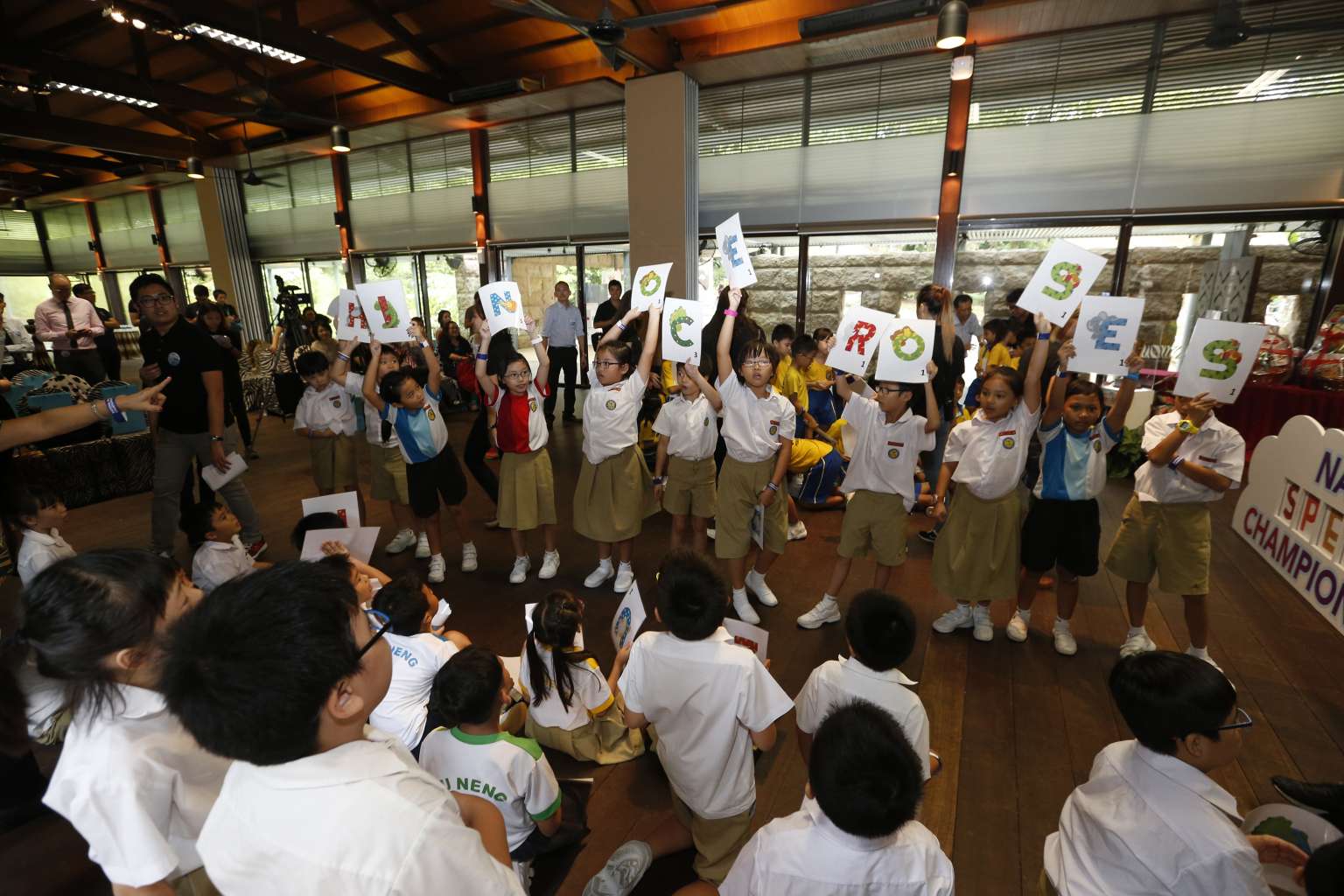 Yu Neng Primary School pupils demonstrating their knowledge of animal names at the Singapore Zoo on Jan 26, 2016, at the launch of the fifth RHB-The Straits Times National Spelling Championship.