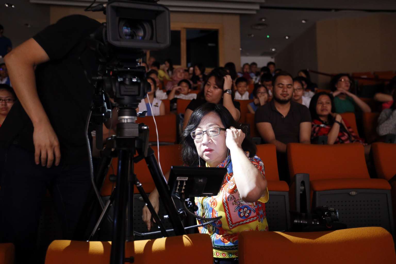 Mrs Soo Kim Bee, a master teacher and arbitrator in the North zone, checking the video playback for the part where the contestant spelt “dominant”, during the zonal round of the RHB-The Straits Times National Spelling Championship 2016.