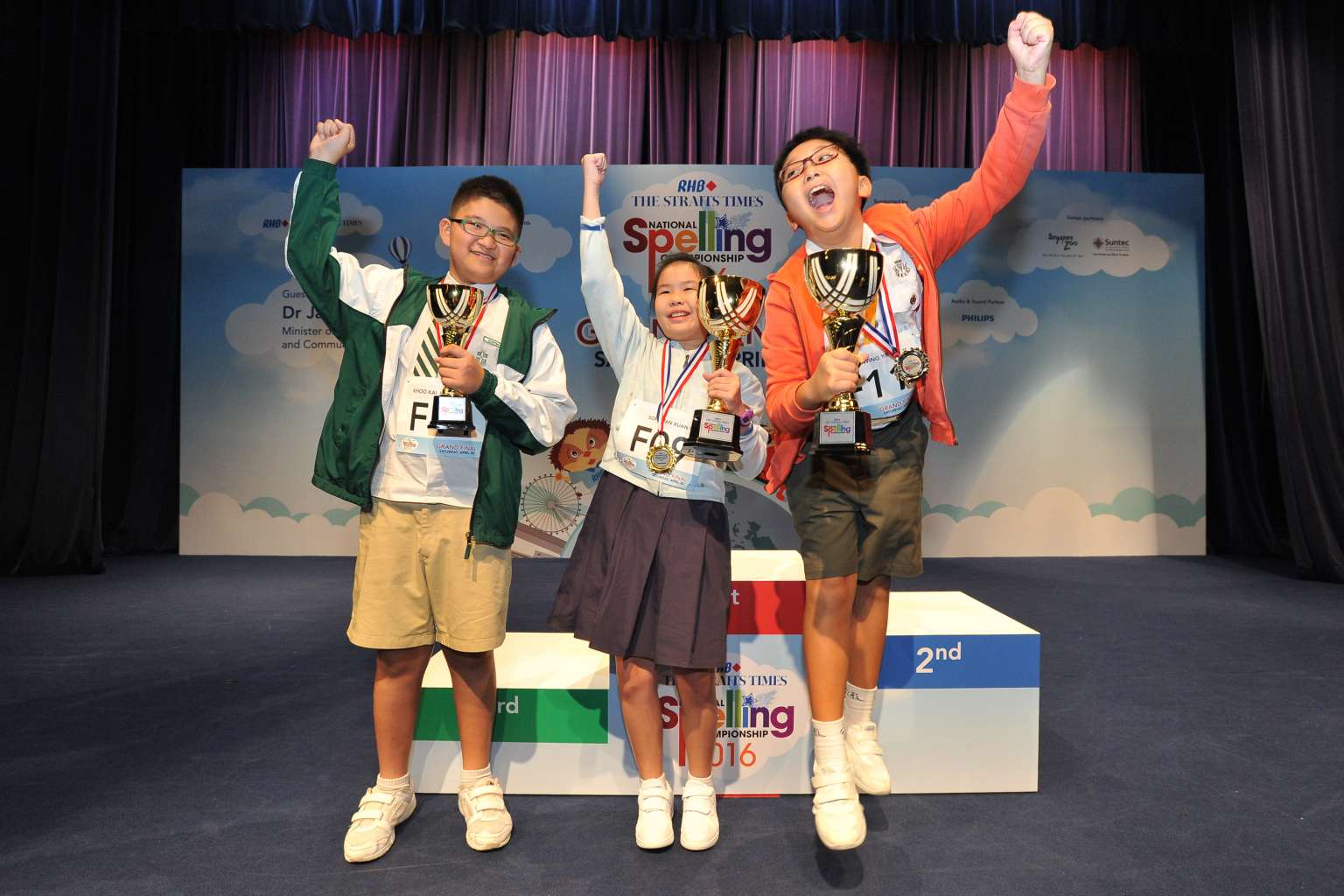 Winners of the RHB-Straits Times National Spelling Championship 2016: (from left) Aloysius Khoo, 12, from St Joseph’s Institution Junior was third; Sophi Tan from Raffles Girls’ Primary School was the champion; and Ho Wing Yip, 11, from Catholic High School (Primary) was second.