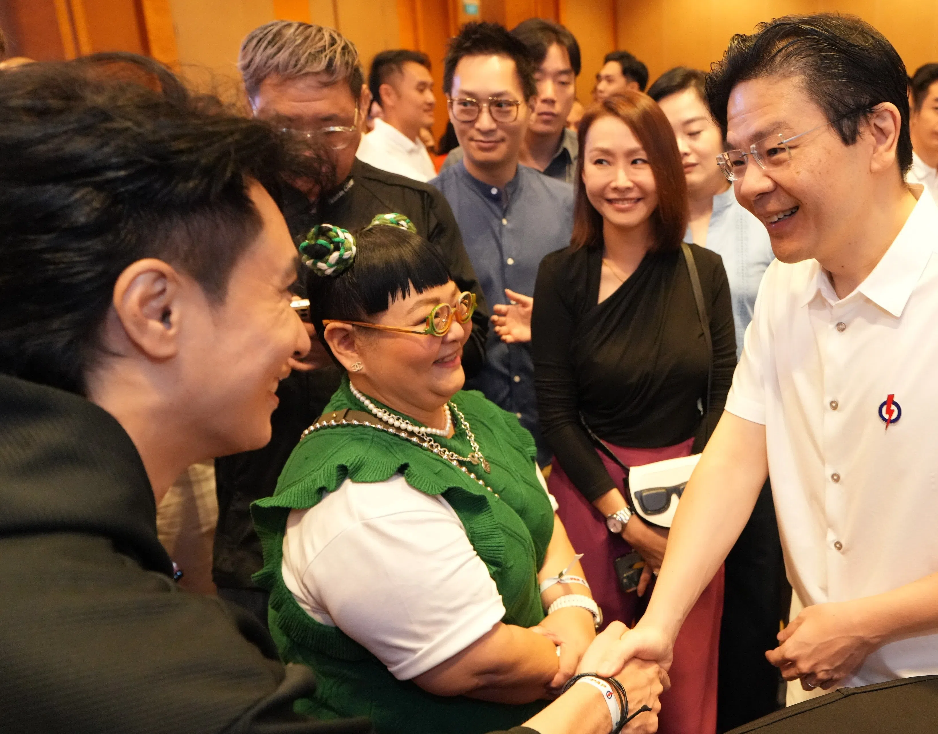 Local artistes Dasmond Koh, Michelle Tay and Ann Kok interacting with PM Lawrence Wong at the Refresh PAP event on June 8.