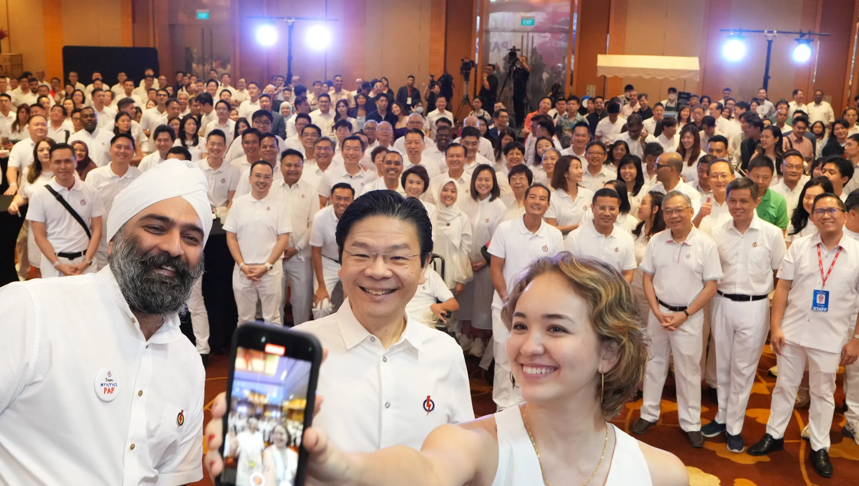 PM Lawrence Wong (centre) posing for a wefie with attendees at the Refresh PAP event on June 8.
