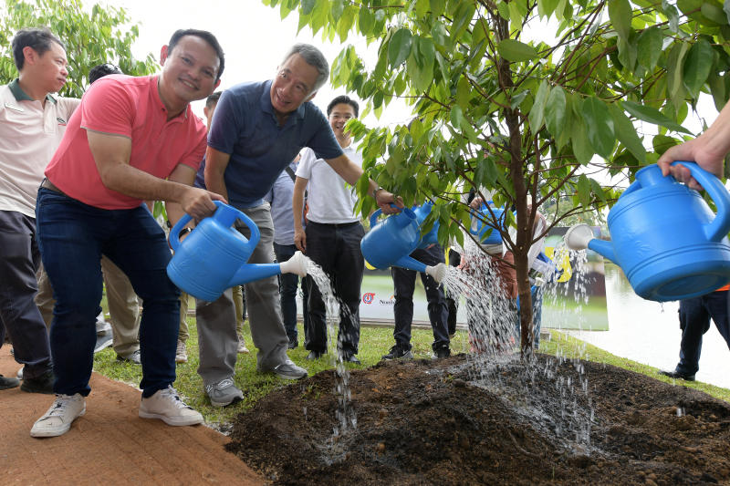 Prime Minister Lee Hsien Loong (right) and Minister of State for National Development and Manpower Zaqy Mohamad taking part in a tree-planting activity as part of the annual Marsiling Community Day on March 10, 2019.