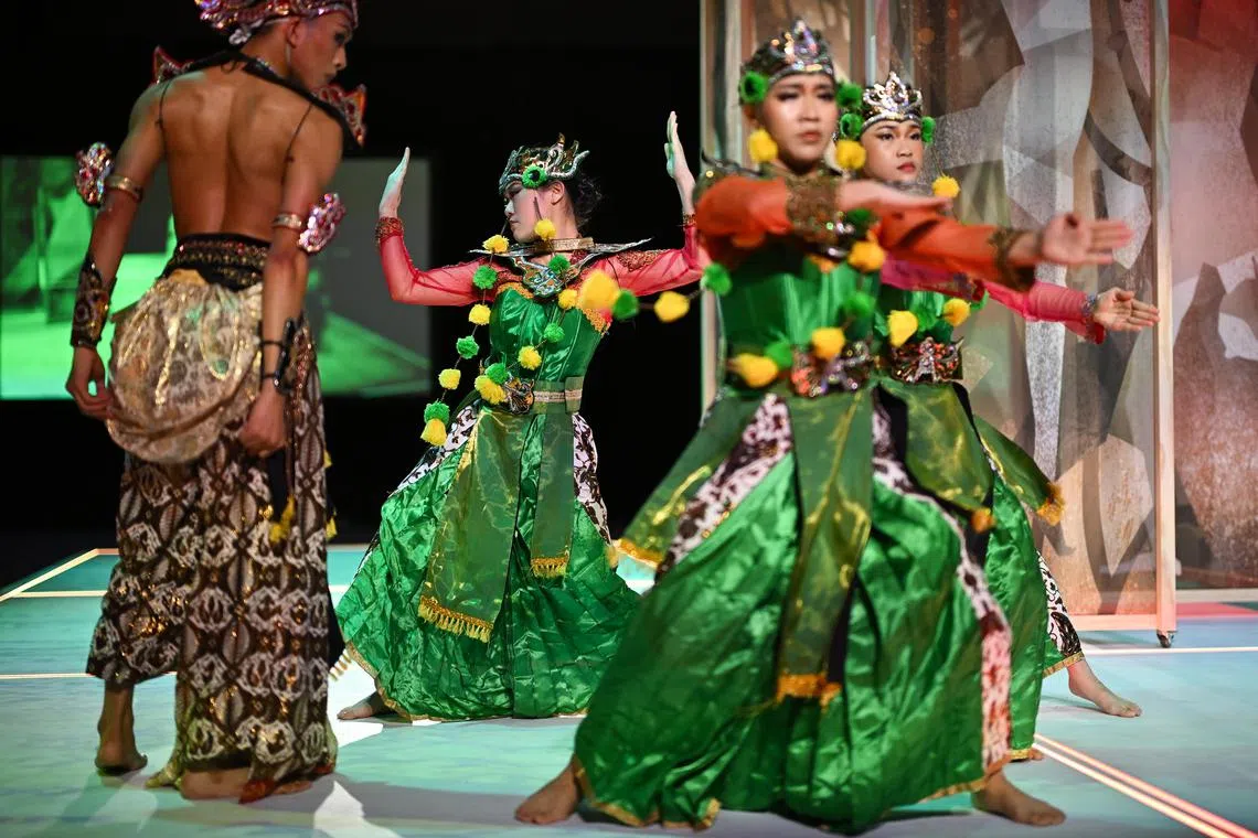 Dancers performing Dancing Puppets, their movements representing wayang kulit or shadow puppetry.