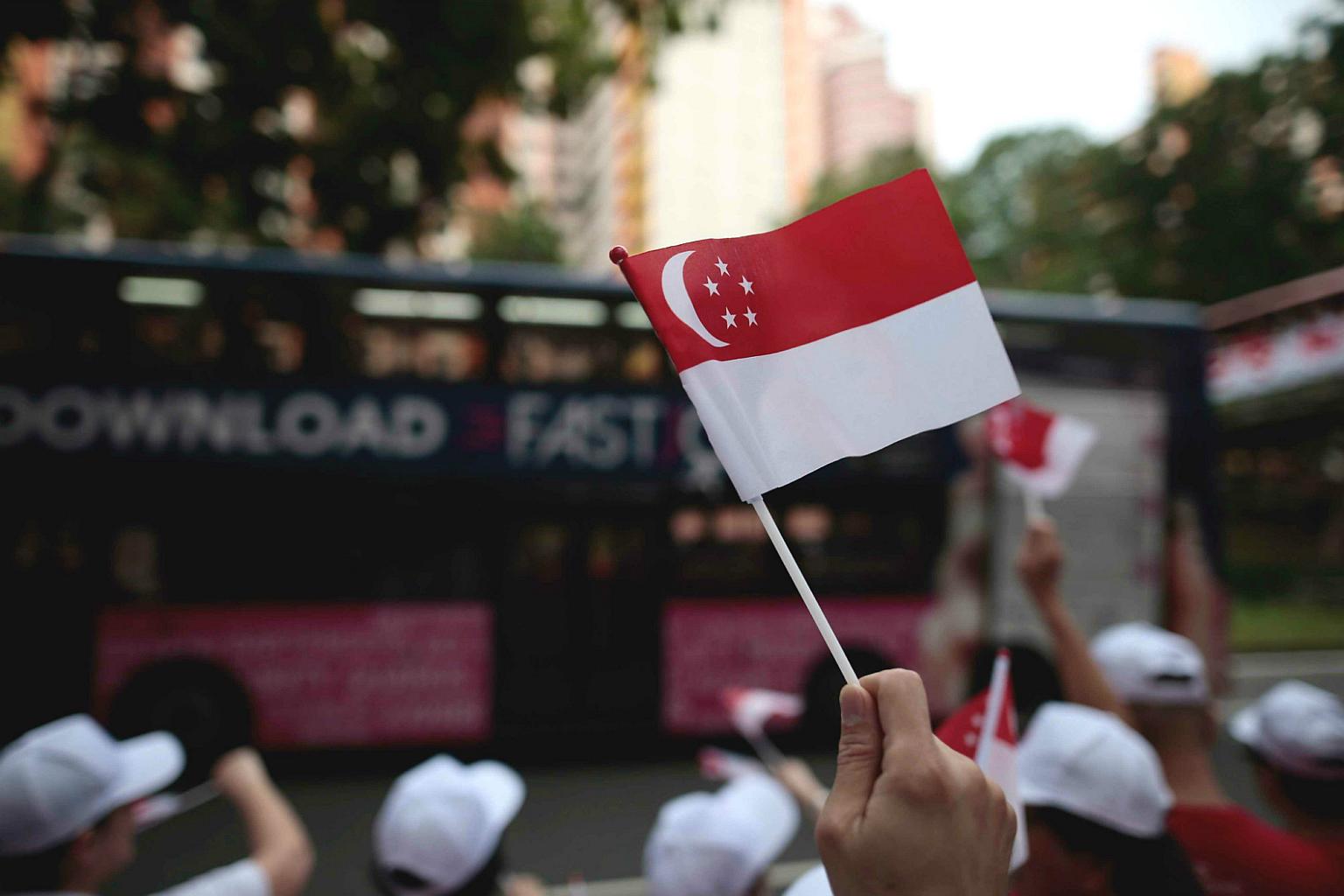 A Singapore flag is held up high during a National Day Observance Ceremony in Singapore.