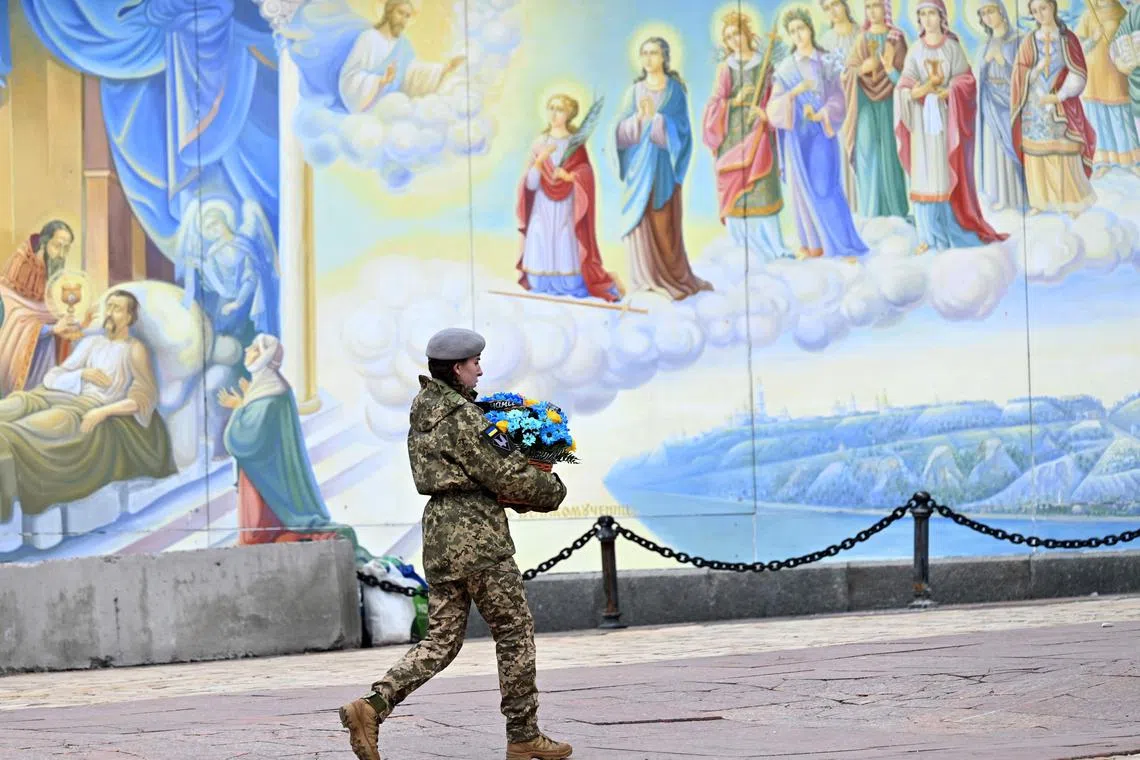 A female Ukrainian soldier carries flowers as she walks to take part in the funeral service of a lieutenant colonel, on Feb 27.