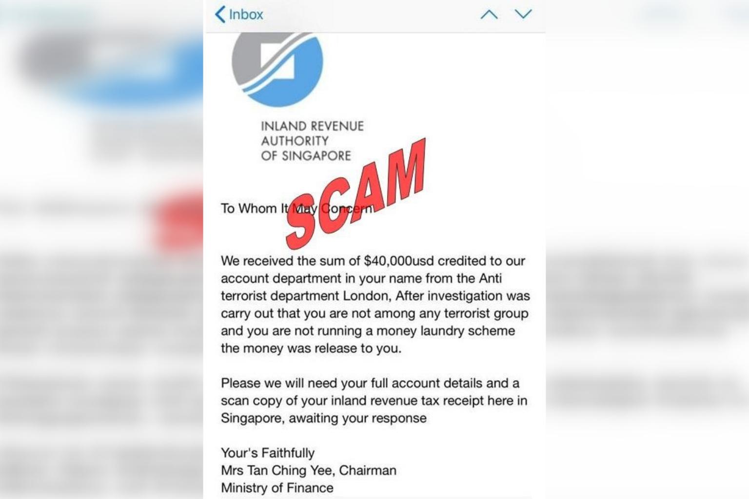 In the e-mail, the sender claims to be the chairman of the Ministry of Finance. Filled with grammatical mistakes, the e-mail asks recipients for their full account details and a scanned copy of their tax receipts, so that US$40,000 (S$54,950) can be credited to them.
