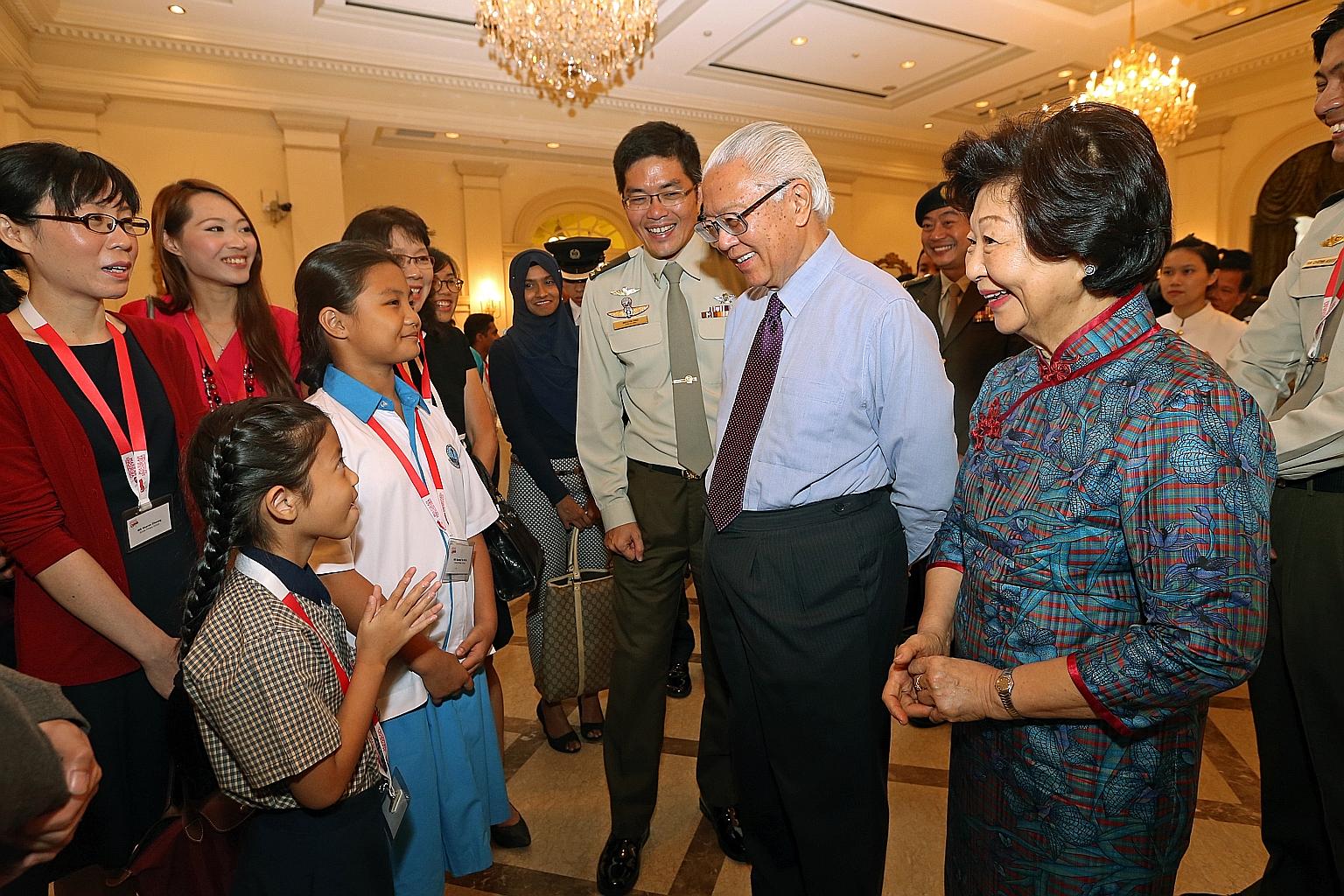 President Tony Tan Keng Yam and his wife, Mrs Mary Tan, chatting with Anderson Primary pupil Kayla Chong, seven, (far left) and Eunos Primary pupil Rachel Yu, 10, (second from left) during a reception at the Istana yesterday. The President and his wife hosted the event for the organisers and participants of the National Day Parade to thank them for their contributions. Also present was the new Chief of Army, Brigadier-General Melvyn Ong (centre), who was the chairman of the executive committee that planned this year's parade.