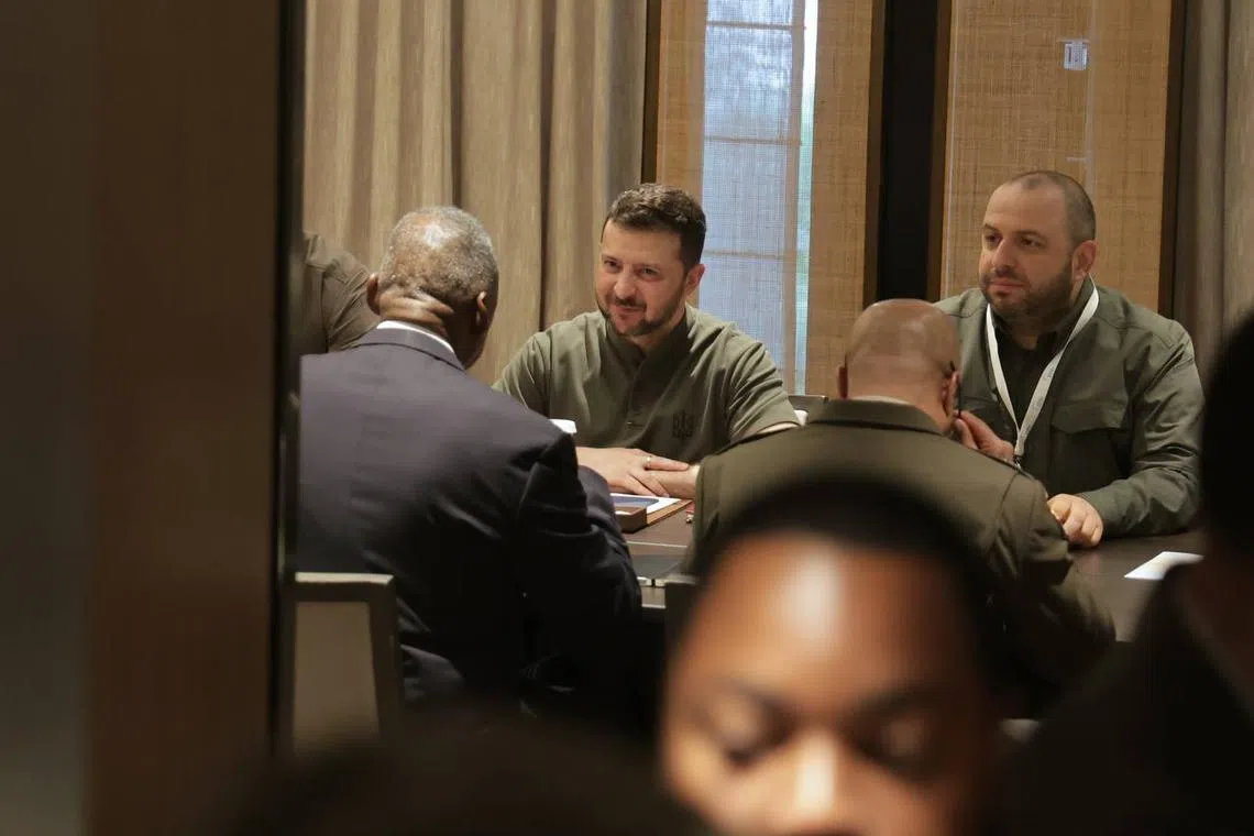Ukrainian President Volodymyr Zelensky (centre) meeting US Defence Secretary Lloyd Austin (with back to camera) at the Shangri-La Dialogue on June 2.