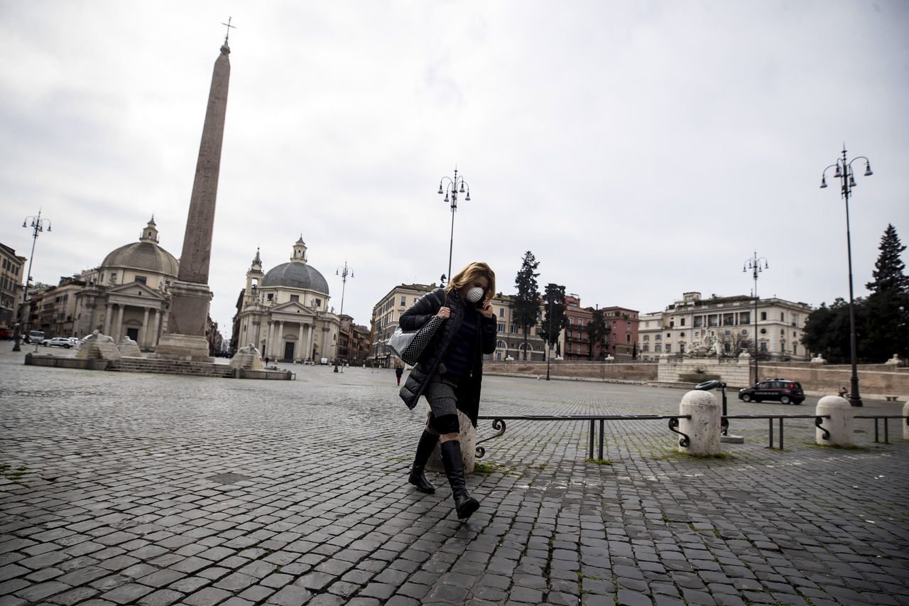 A woman with a protective mask walks across the Piazza del Popolo in Rome, Italy, on March 17, 2020.