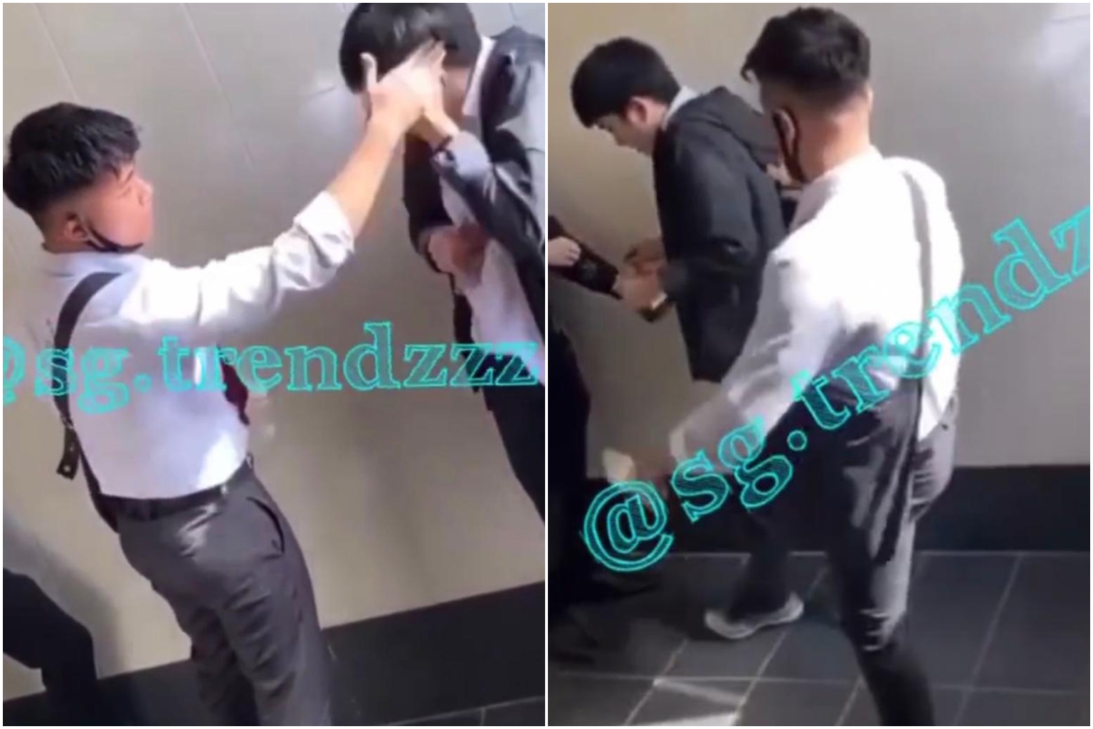 In a video that spread on social media, the main aggressor is seen restraining a student while repeatedly asking him "what's wrong with you" in a men's toilet at ITE College Central. At least three others look on, including a youth who appears to be blocking the exit.