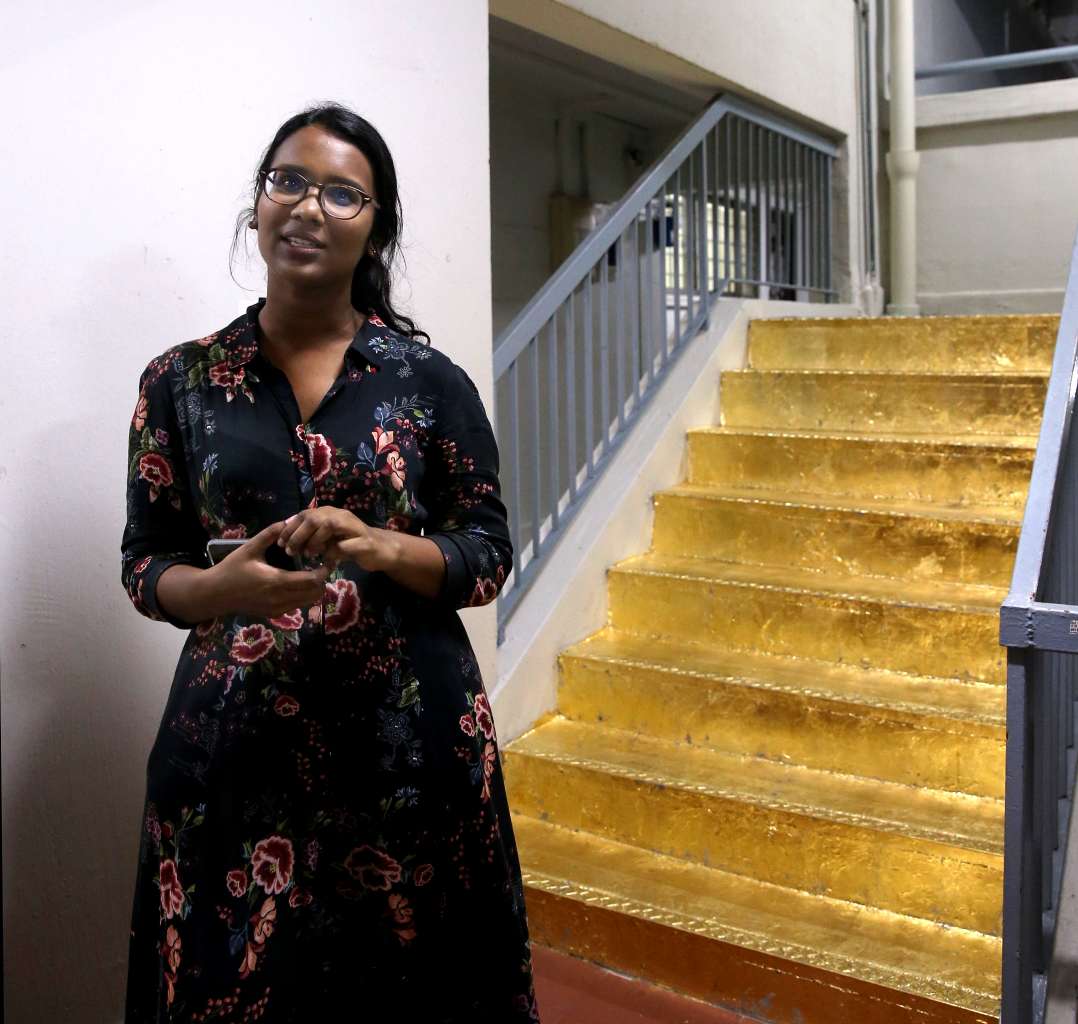 Miss Priyageetha Dia took five hours to transform the staircase with gold foil.