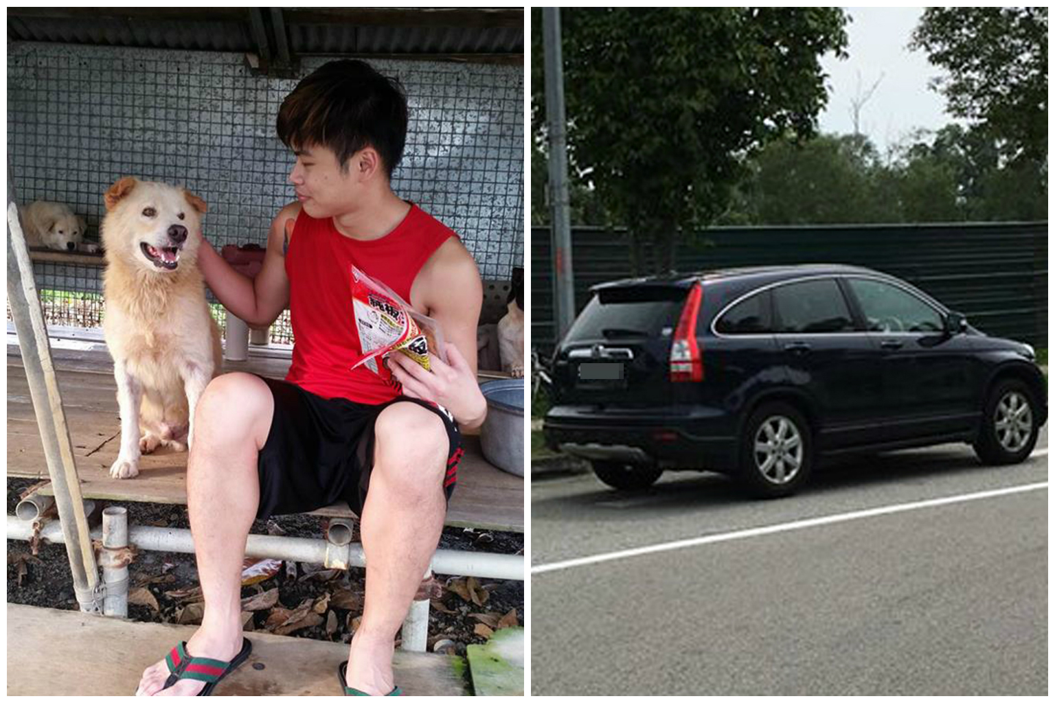 Mr Ong Ren Qin with Sayang, a dog that was injured in the accident. The car (right) that allegedly drove over Sayang.