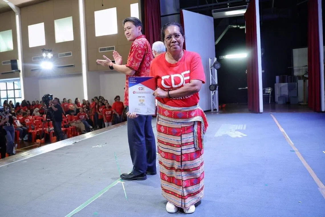 Ms Hilda Tunliu collected her certificate from Senior Parliamentary Secretary for Manpower Shawn Huang at a graduation ceremony on Feb 8 for those who completed the conversational Hokkien class.