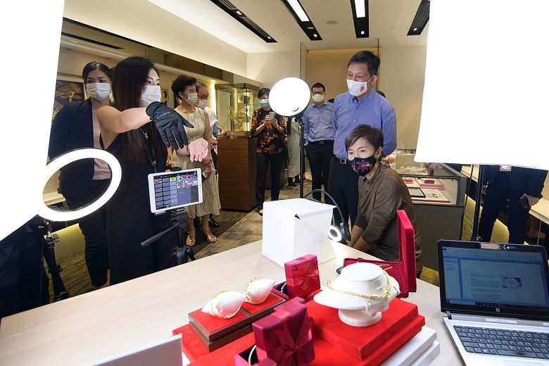 Manpower Minister Josephine Teo and Trade and Industry Minister Chan Chun Sing observing a live-streaming rehearsal yesterday by SK Jewellery Group at the company's headquarters in Changi Business Park.