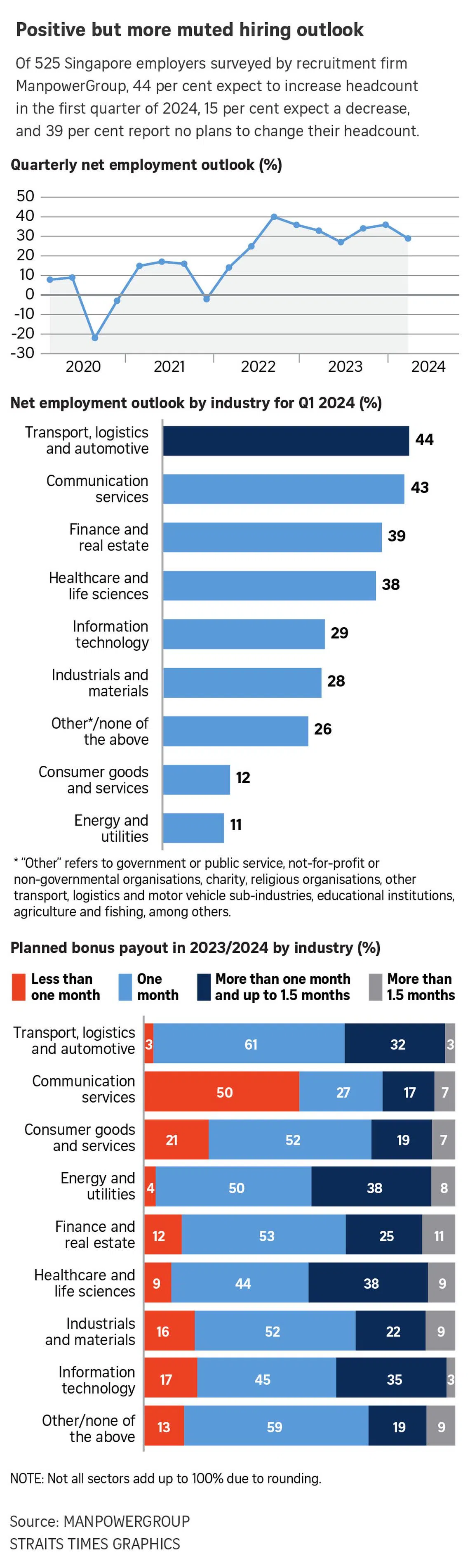 SINGAPORE – More than eight in 10 Singapore employers still intend to hand out bonuses of at least a month’s salary, even as a weaker hiring climate beckons in 2024.