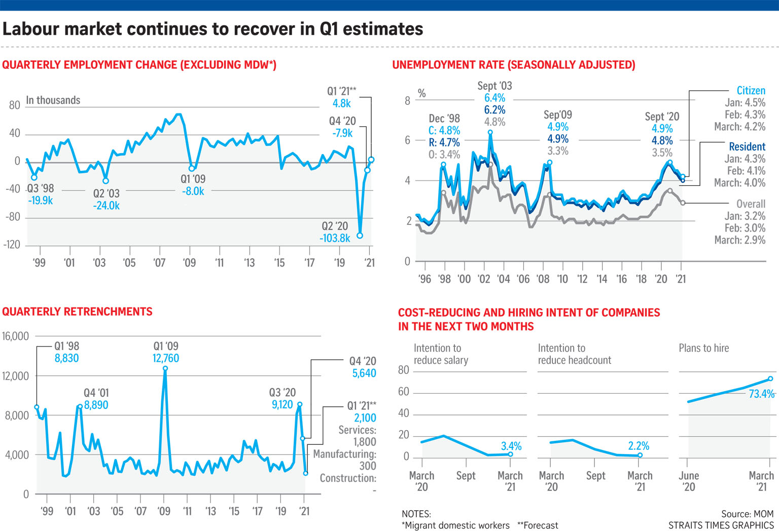 Analysts told The Straits Times that while the latest MOM data is encouraging, it is unlikely that the labour market will recover to pre-pandemic levels this year.