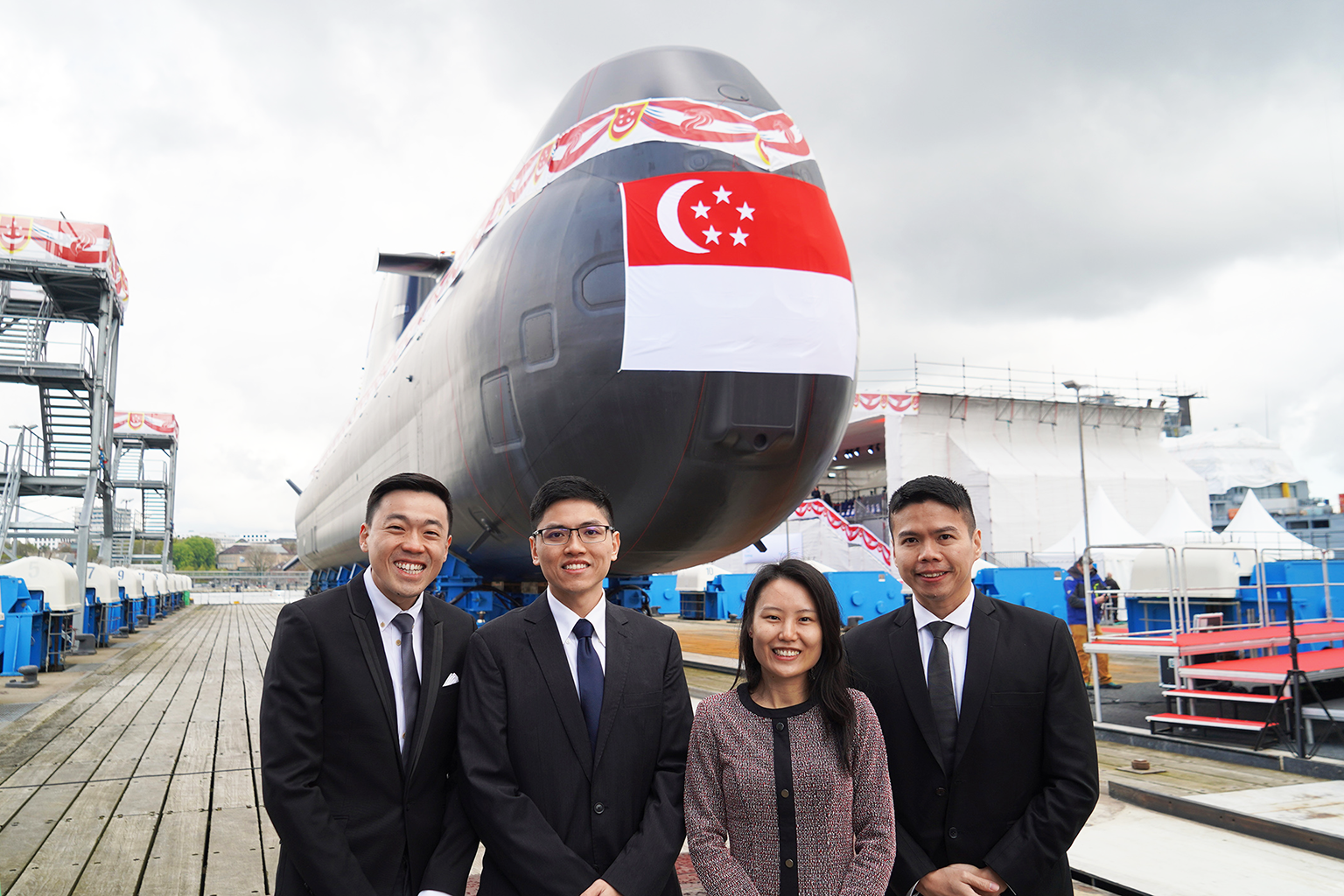 Mr Neo Ya Kai (second from left) and his colleagues at the launch of the Republic of Singapore Navy's fourth Invincible-class submarine in Germany in April 2024. PHOTO: DSTA