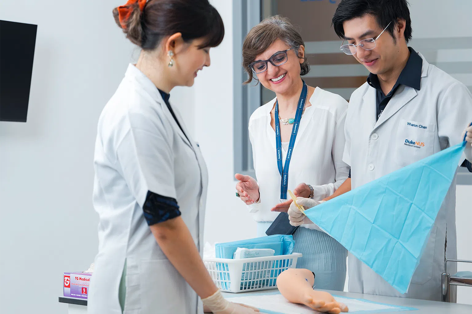 Associate Professor Shiva Sarraf-Yazdi with Duke-NUS students during one of their clinical education programmes, practising procedural skills in a safe environment.