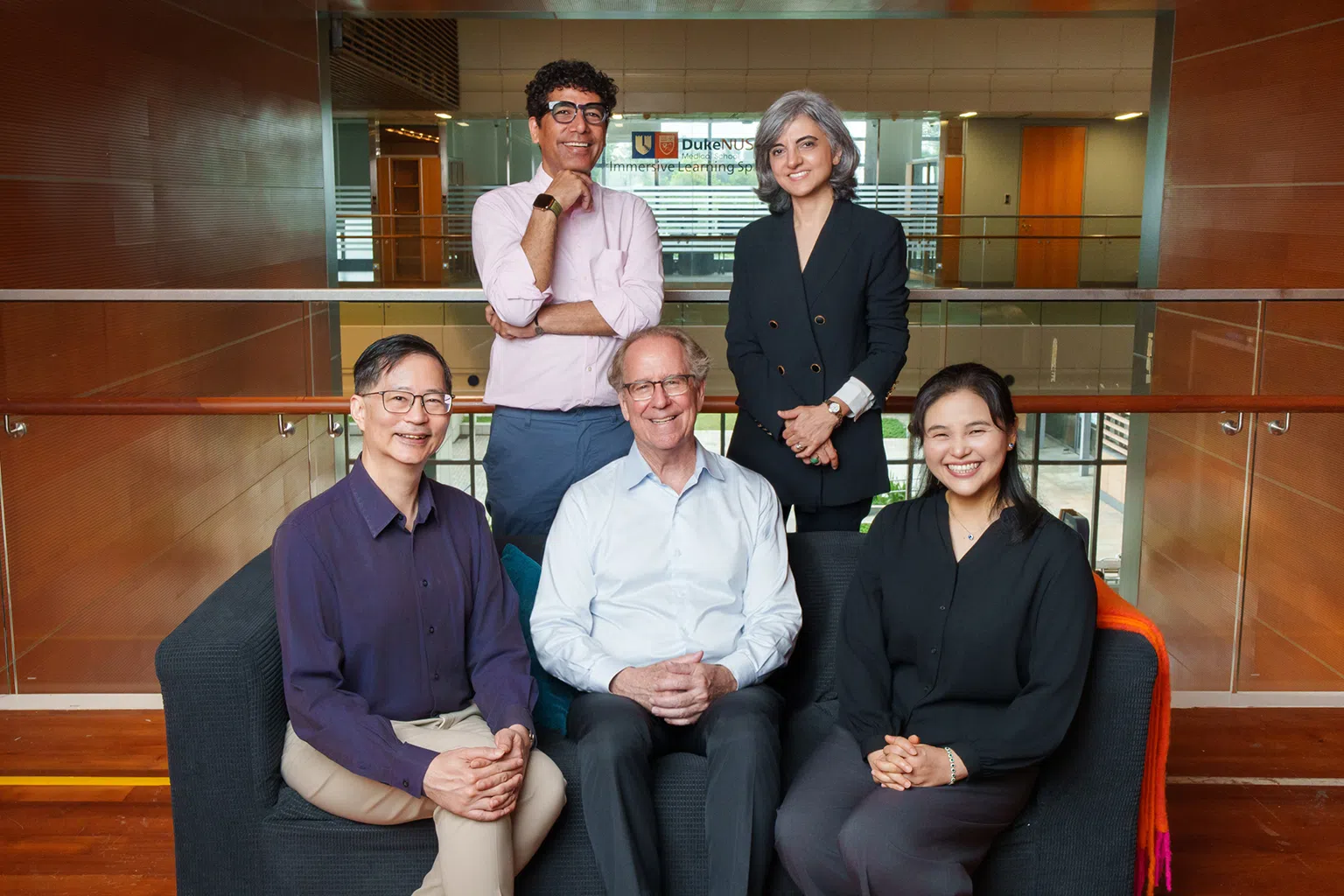 A spirit of innovation at Duke-NUS Medical School empowers every member to push boundaries, to transform medicine and improve lives. (Seated, from left) Professor Patrick Tan, senior vice-dean for research; professor Thomas Coffman, dean; and Dr Zhou Jin, principal research scientist. (Standing, from left) Mr Anirudh Sharma, director, communications and strategic relations; and associate professor Shiva Sarraf-Yazdi, vice-dean for education.