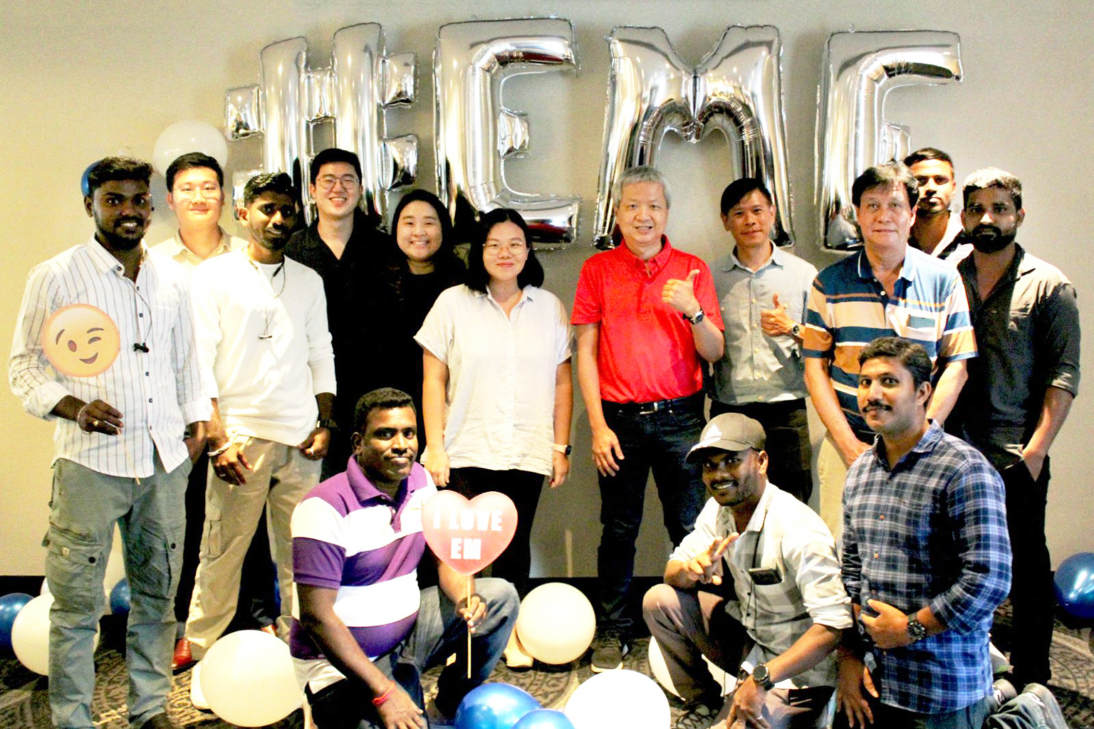 Ms Chia Yi Fang (sixth from left) with her supervisors Mr Jimmy Chou (seventh from left) and Mr Francis Hong (eighth from left), and the EM Services engineering team at a company gathering. PHOTO: EM SERVICES