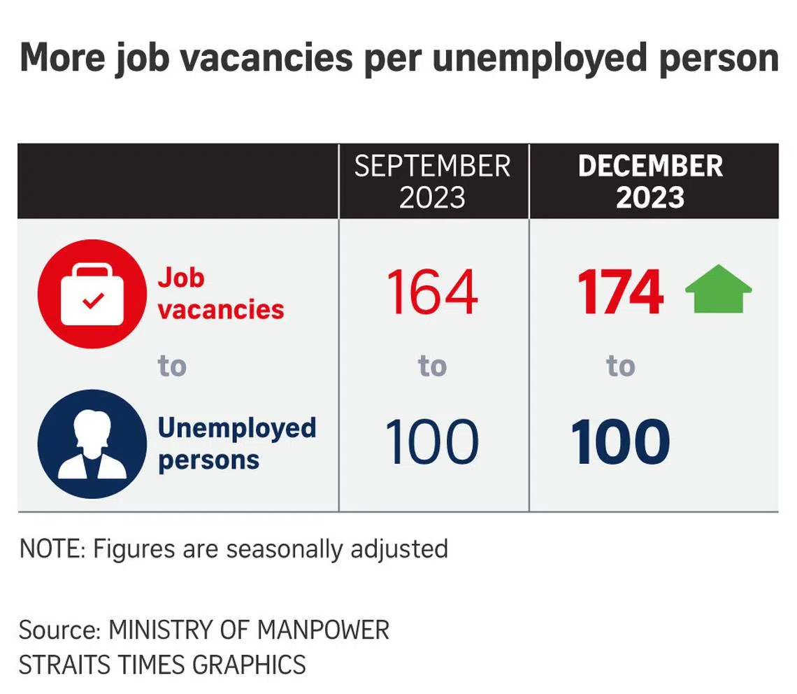 The Ministry of Manpower (MOM) noted in a labour market report for the fourth quarter of 2023, released on March 14, that the growth came as the employment rate for residents – Singaporeans and permanent residents – remains high, while the resident unemployment rate remains low at 2.8 per cent.