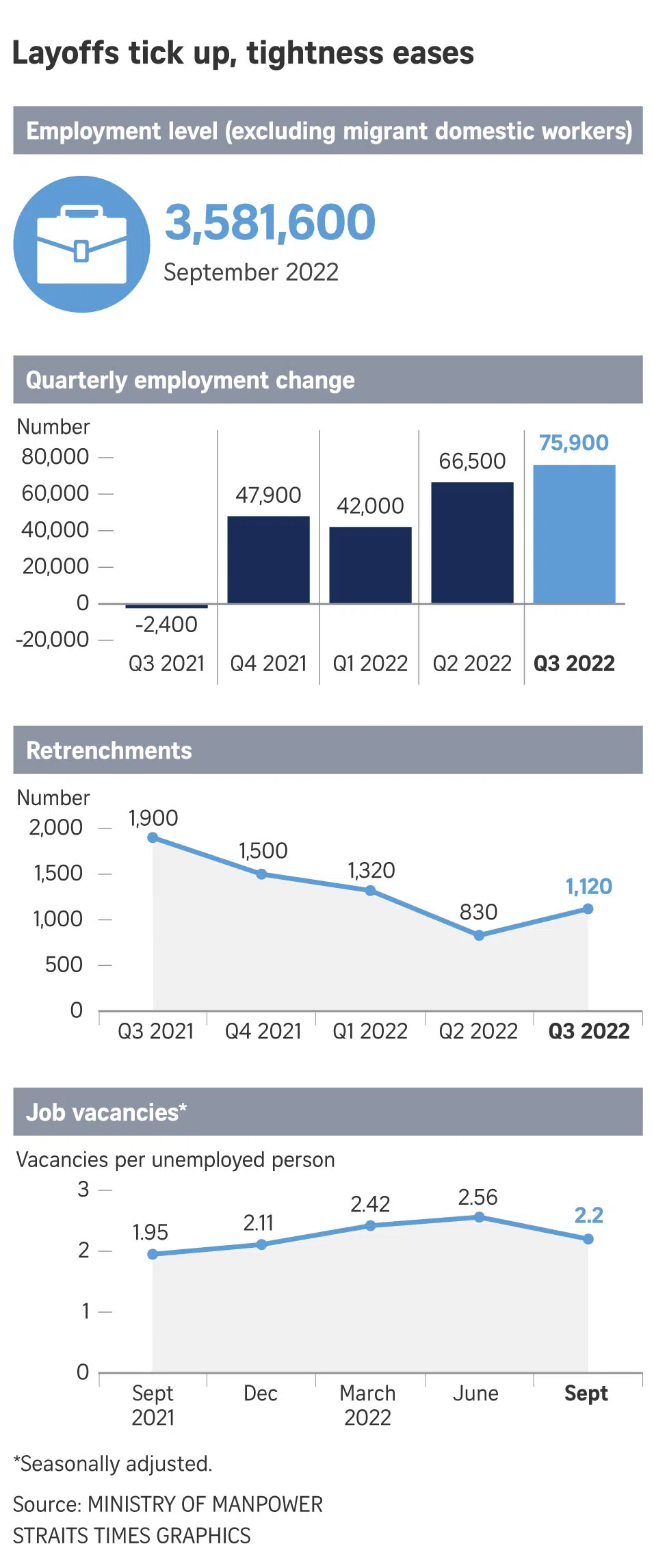 SINGAPORE – Retrenchments in Singapore increased in the third quarter of this year, up from the previous quarter’s record low, while the overall tightness in the labour market eased with job vacancies dropping for a second straight quarter.