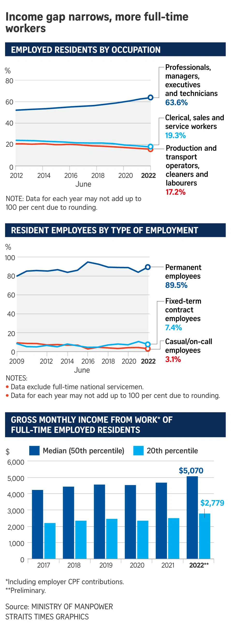 The growth exceeds that seen from 2014 to 2019, as well as 2021, and workers in the 20th percentile can expect their wages to be 55 per cent of the median, the lowest gap since 2004, MOM said.