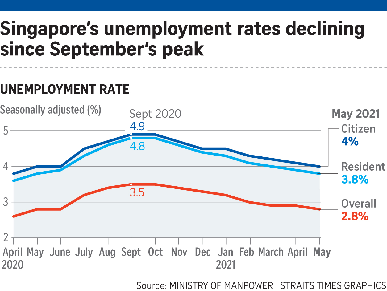 Singapore's unemployment rates peaked in September last year and persisted through October before falling steadily since November.
