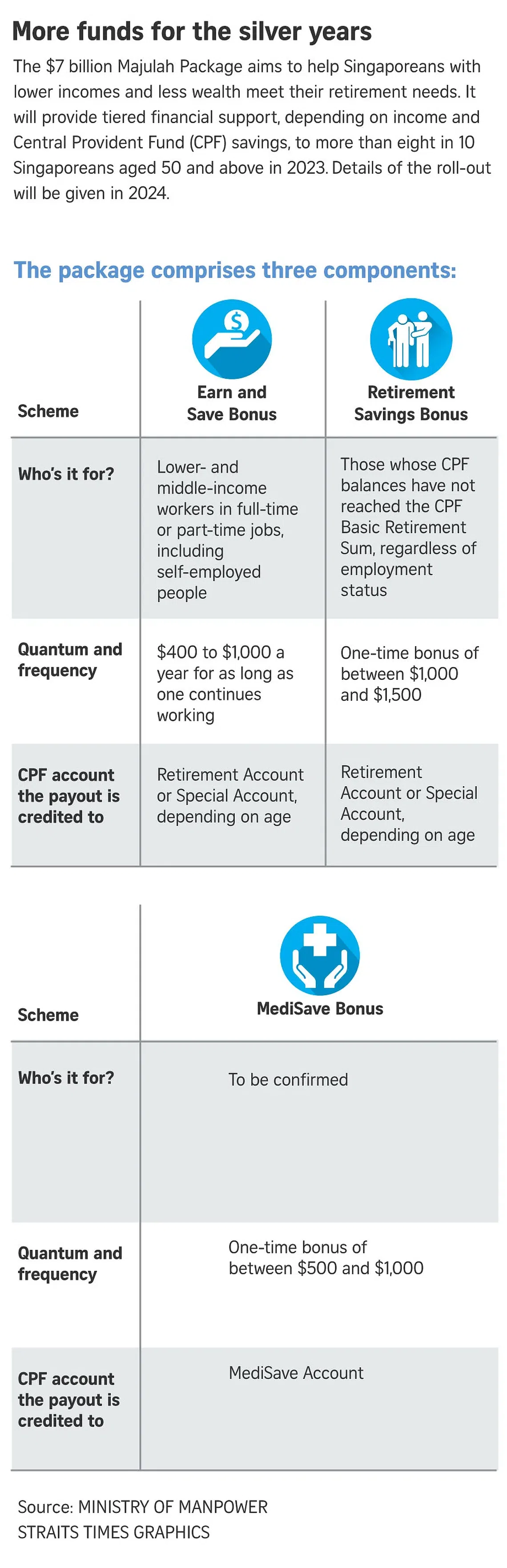 Dr Tan noted that the Majulah Package will be accompanied by improvements to the Workfare Income Supplement Scheme, Silver Support Scheme and the Matched Retirement Savings Scheme, which are slated to be set out by the time of the debate on his ministry’s budget in 2024.