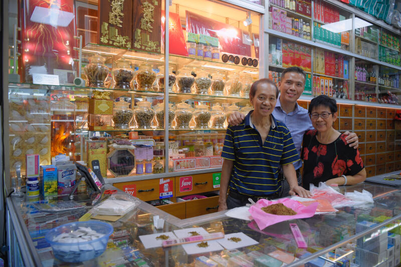 Heng Foh Tong vice-president Lee Chin Siong with his father Lee Khee Lian and mother Chye Nyuk Lian at their family-run TCM hall in Bukit Batok.