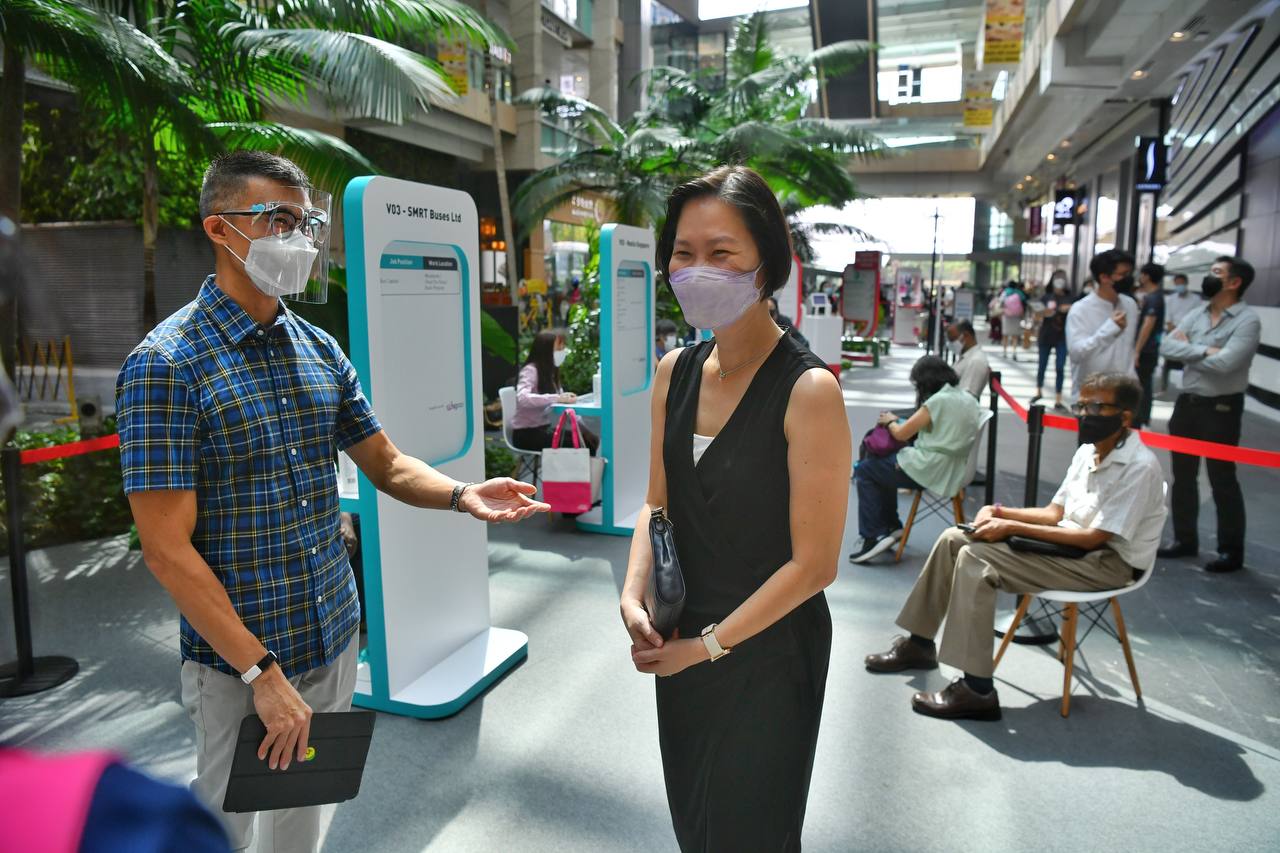 Minister of State for Ministry of Education and Ministry of Manpower Gan Siow Huang (right), at the SSGxWSG Jobs & Skills Fair, on July 23, 2021.