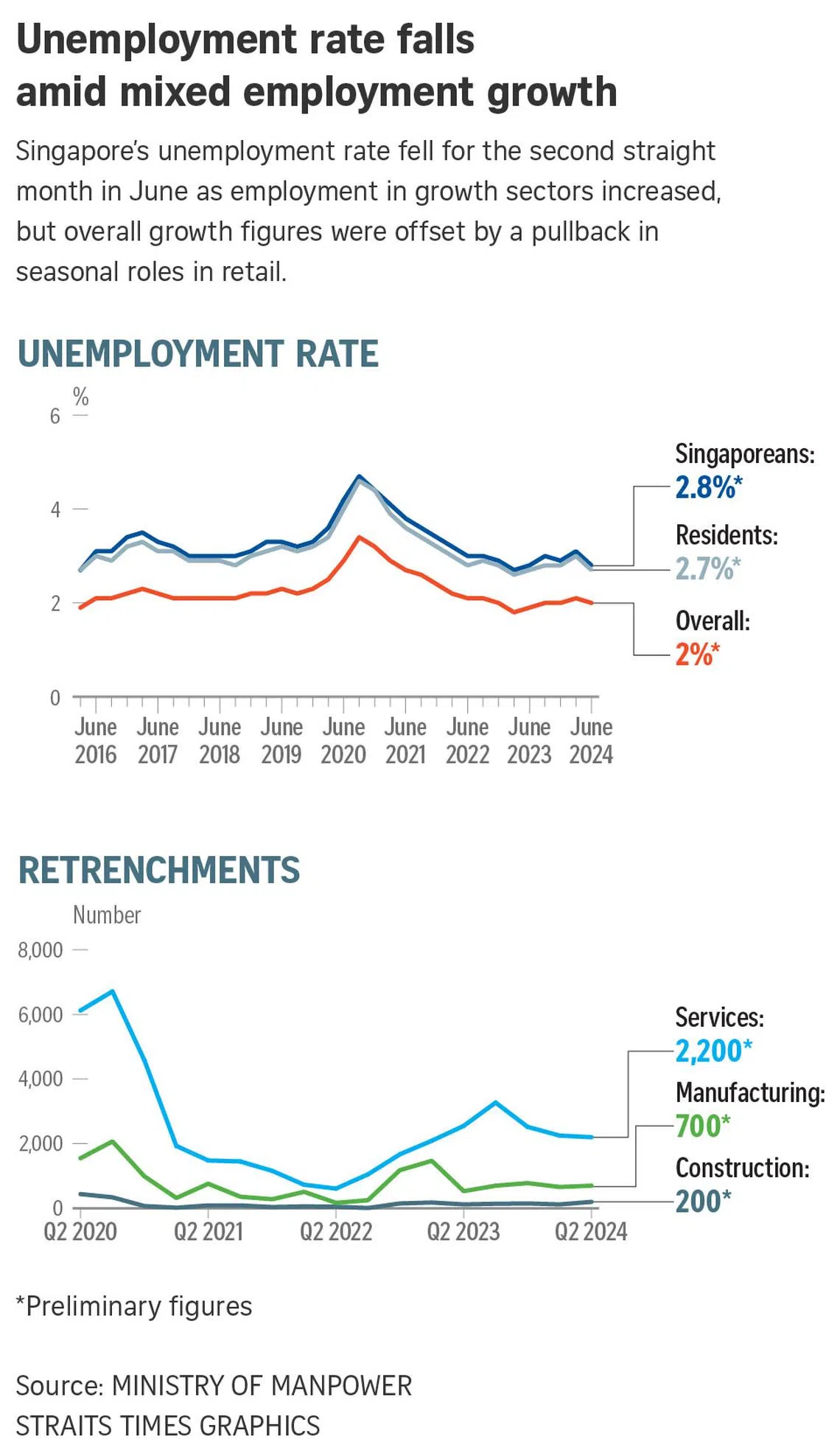 The Ministry of Manpower (MOM) said in its report on the data that the unemployment rate of Singaporeans fell from 3 per cent in May 2024 to 2.8 per cent in June 2024.