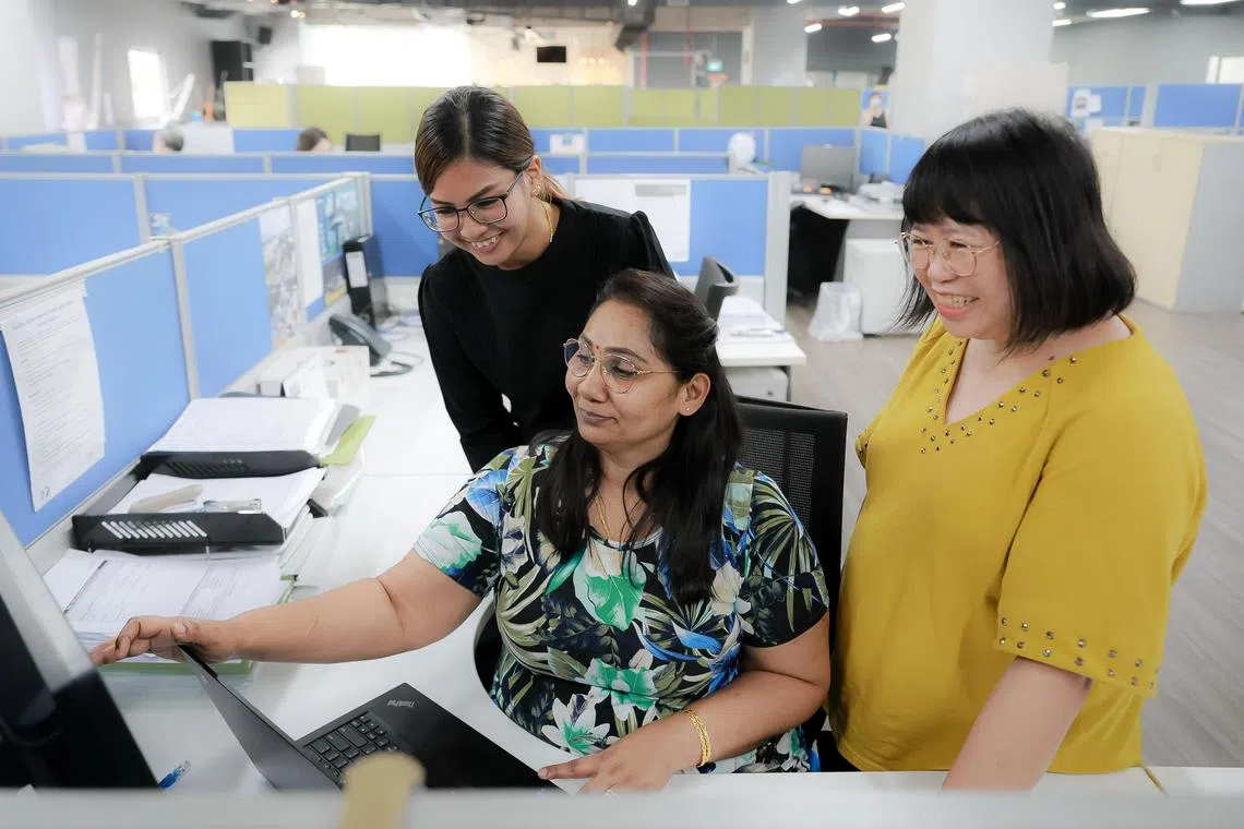 Bok Seng Logistics administrative staff (from left) Azirah Adnan, 28; Parvaetrrhi Balakrishna, 48; and Chan Nyet Lan, 51, at their workplace in Tuas.