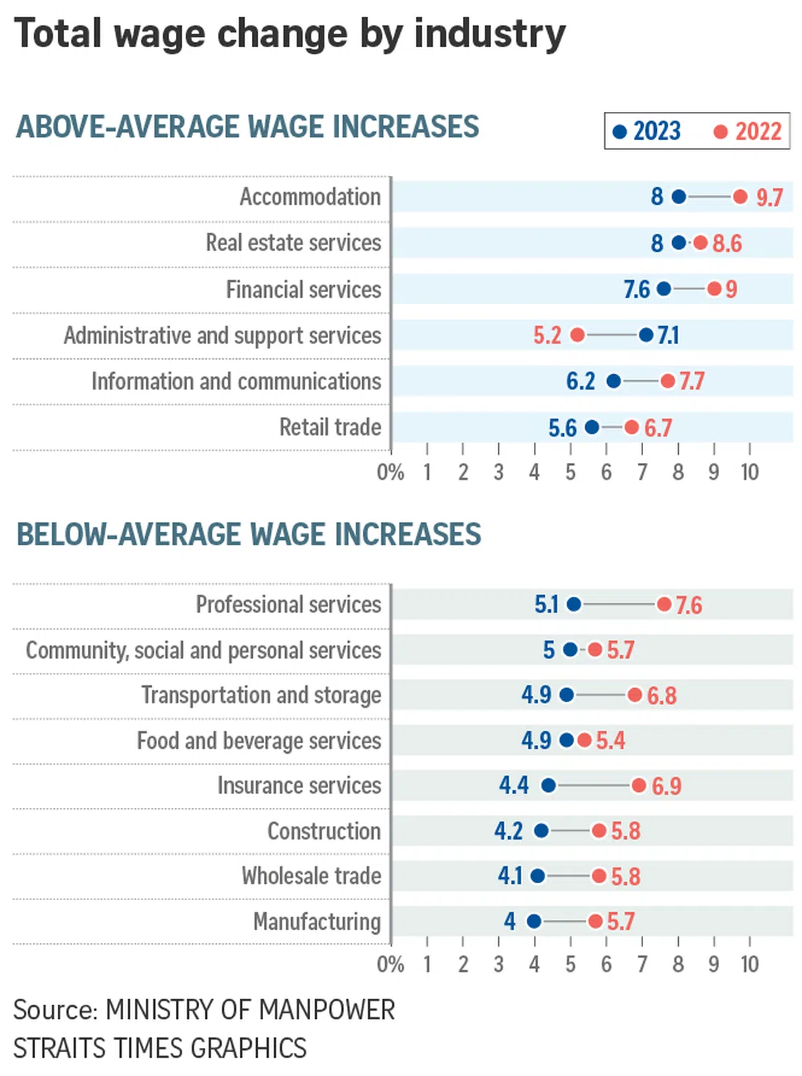 MOM also said the below-average wage increases in manufacturing and construction came amid a slowdown in goods-producing industries affected by external headwinds such as global supply chain disruptions.