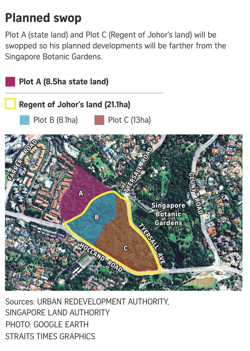 SLA and URA said in June that Tunku Ismail intends to develop his land, and that the swop was agreed upon so his planned developments will be farther away from the 49ha portion of the Singapore Botanic Gardens that was inscribed as a Unesco World Heritage Site in 2015.