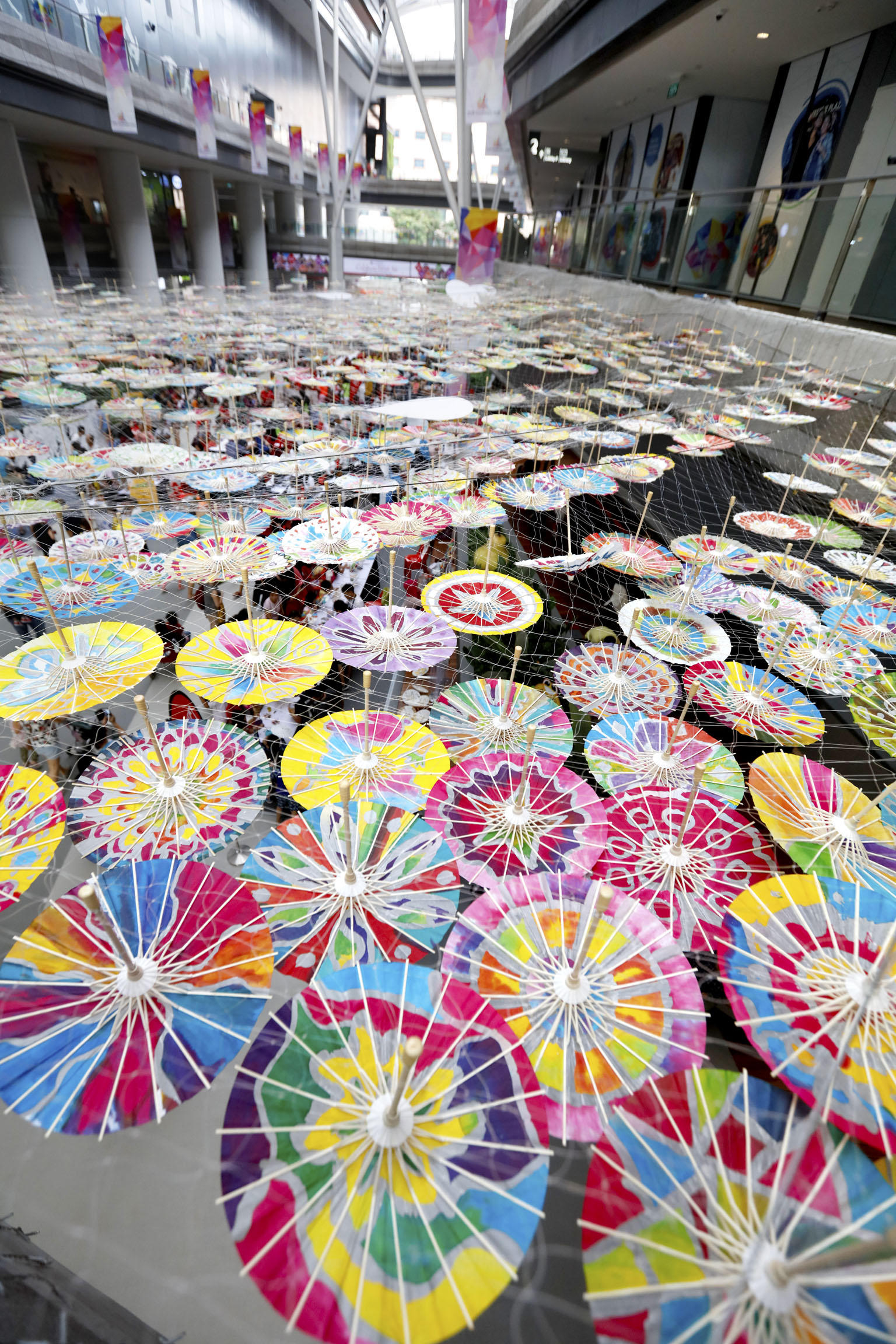Tampines Hub was awash on Saturday with a sea of mini batik umbrellas painted in bright hues by residents for its Urban Arts Fest, organised as part of the People's Association PAssionArts Festival. More than 1,000 residents put their talents to good use, creating the 1,450 umbrellas, which were put up in a mid-air canopy art installation. This colourful installation is on display until Saturday - along with another highlight, a 25m-long by 1.5m-high wall filled with artistic pen drawings.
