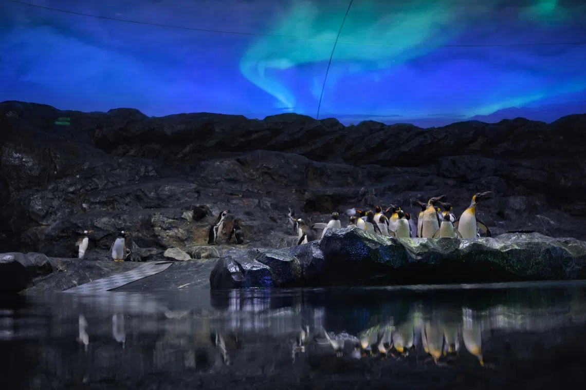 Penguins are seen under a simulated version of the southern lights at Bird Paradise.