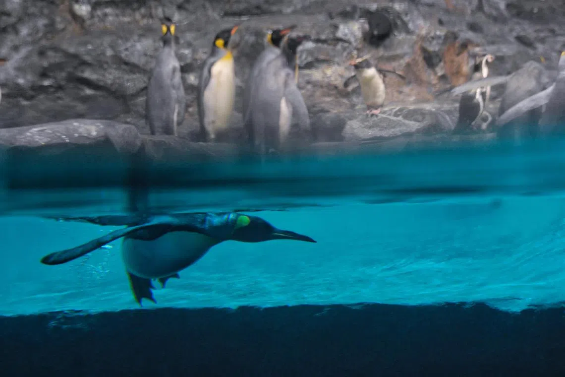 A king penguin is seen swimming in the water after barricades were removed from the enclosure at Bird Paradise.