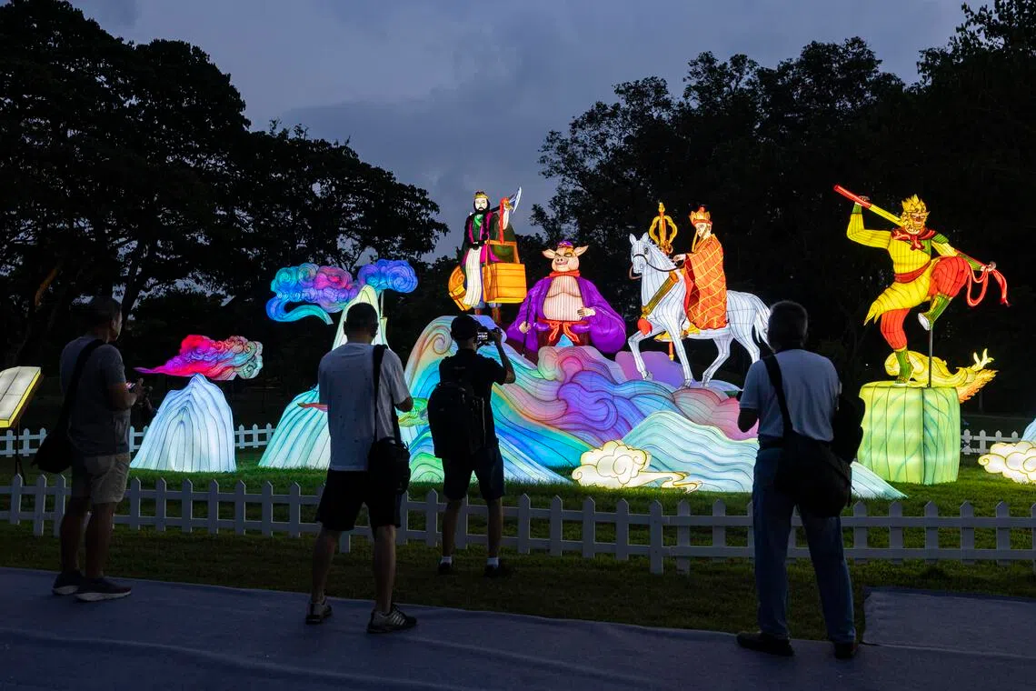 Visitors taking pictures of the Journey to the West lantern display at the Butterfly field in Jurong Lake Gardens on Sept 25.