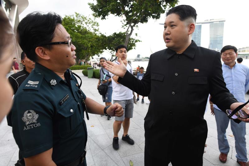 Kim Jong Un impersonator "Howard X" is approached by an auxiliary policeman outside the Esplanade on May 27, 2018.