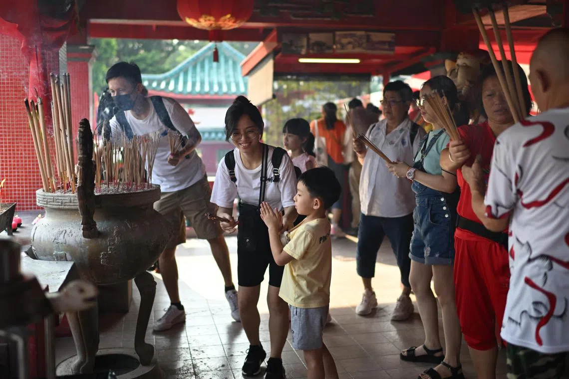 Delivery rider Pay Hwee Kiat, 30, sported matching red T-shirts with his wife of two years, customer service executive Soh Xun Ling, 35. The couple, who are trying for a child, were on the first of three visits to the shrine. “We have to come here three times for our prayers to work,” said Mr Pay.