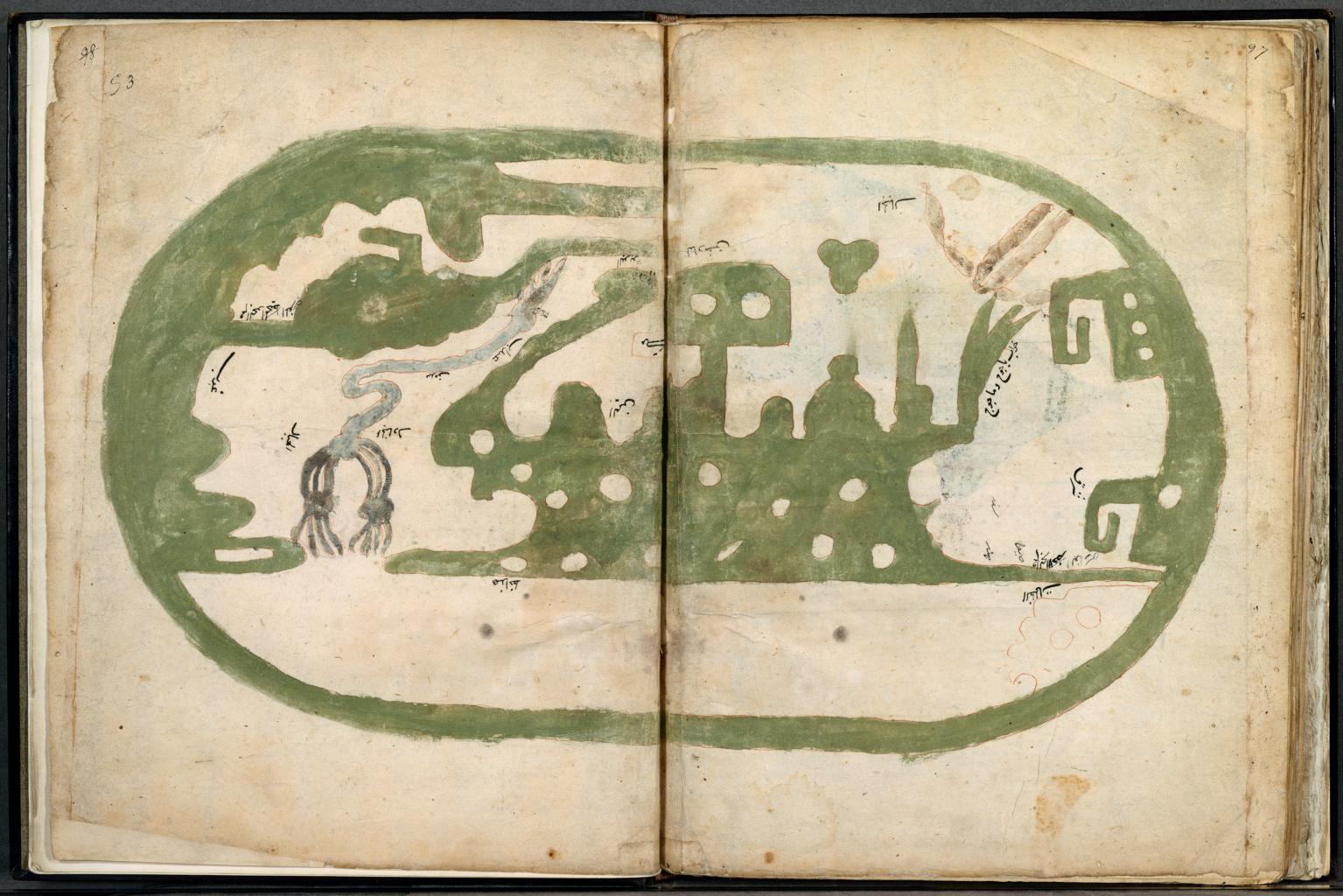 The 15th century map in a manuscript is on loan from the Bibliotheque Nationale de France. Kitab surat al-ard, or Book of the Configuration of the Land, was written in the 10th century by Arab traveller and geographer Ibn Hawqal.