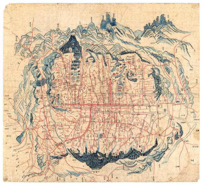 This 1895 Joseon Dynasty map presents a 360-degree worm's-eye view - looking outwards from the centre - of Seoul, as opposed to a more conventional bird's-eye view.