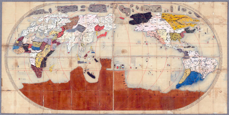 Tracing back to Japan's Edo period between 1603 and 1867, this map takes reference from Jesuit priest Matteo Ricci's 1602 world map Kunyu Wanguo Quantu, created in China.