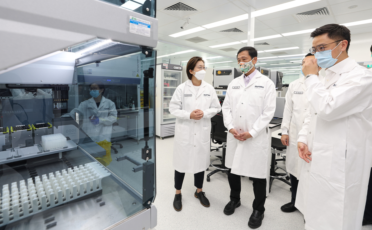 Health Minister Ong Ye Kung (second from left) being briefed during his visit to one of Mirxes' laboratories.
