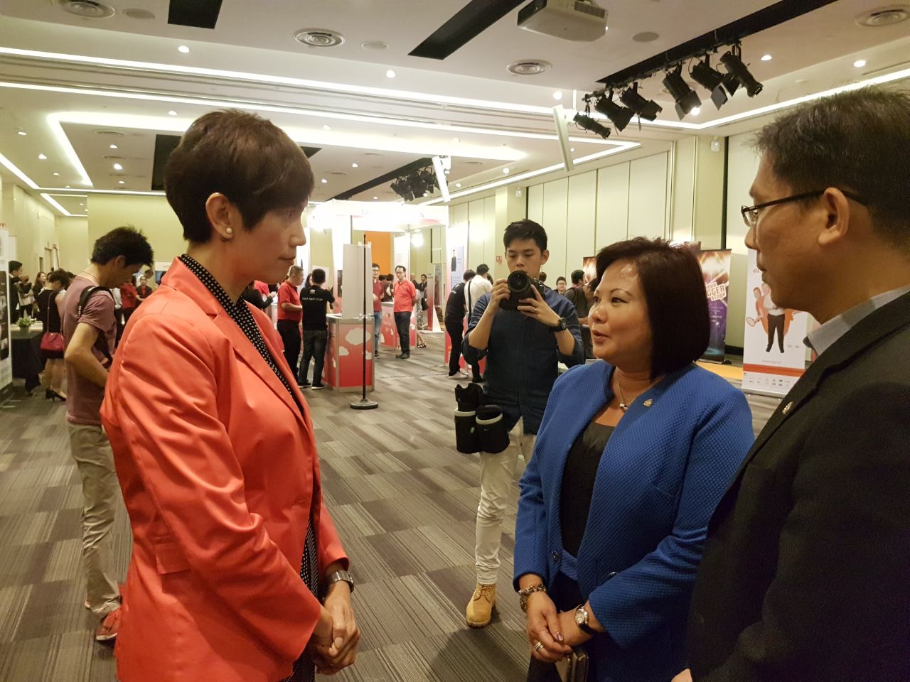 Mrs Josephine Teo (left) talking to Ms Angeline Tan, general manager of Park Hotel Alexandra, and Mr Chng Chee Meng, 42, human resource manager at Park Hotel Group, on July 21, 2017.