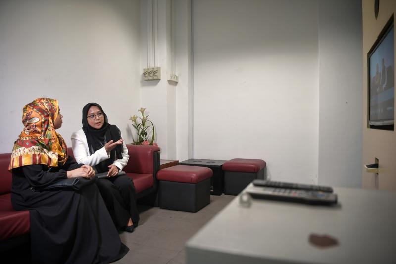 Madam Siti Hazlinda Karim (right), a senior counsellor at Jamiyah Counselling Centre, during a reenactment of the Marriage Counselling Programme with incarcerated parties, spouse and counsellor at the Kampong Ubi Community Centre on June 21, 2019.